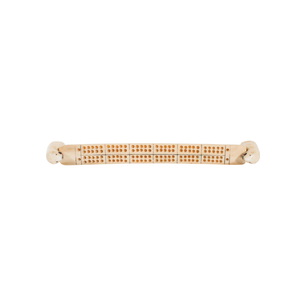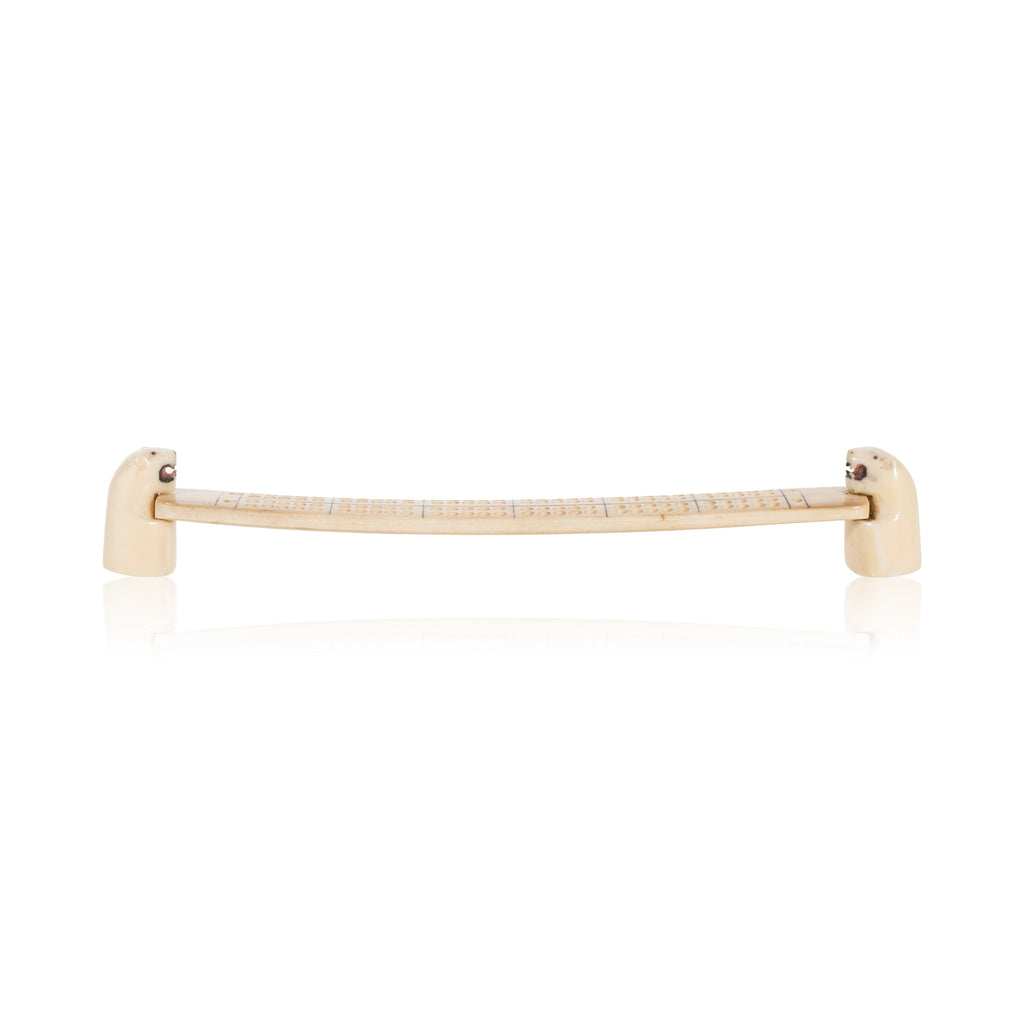 Inuit cribbage board of walrus ivory held by two polar bears.