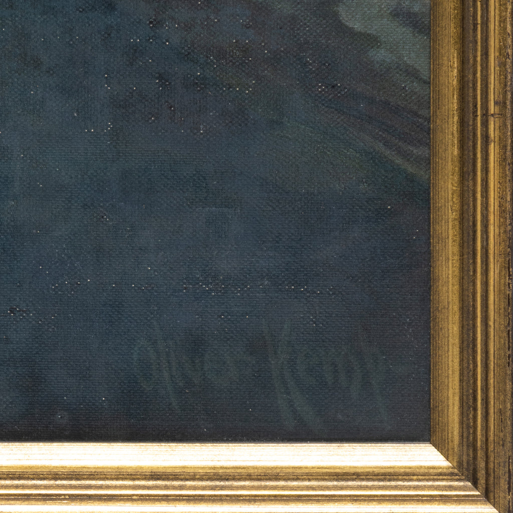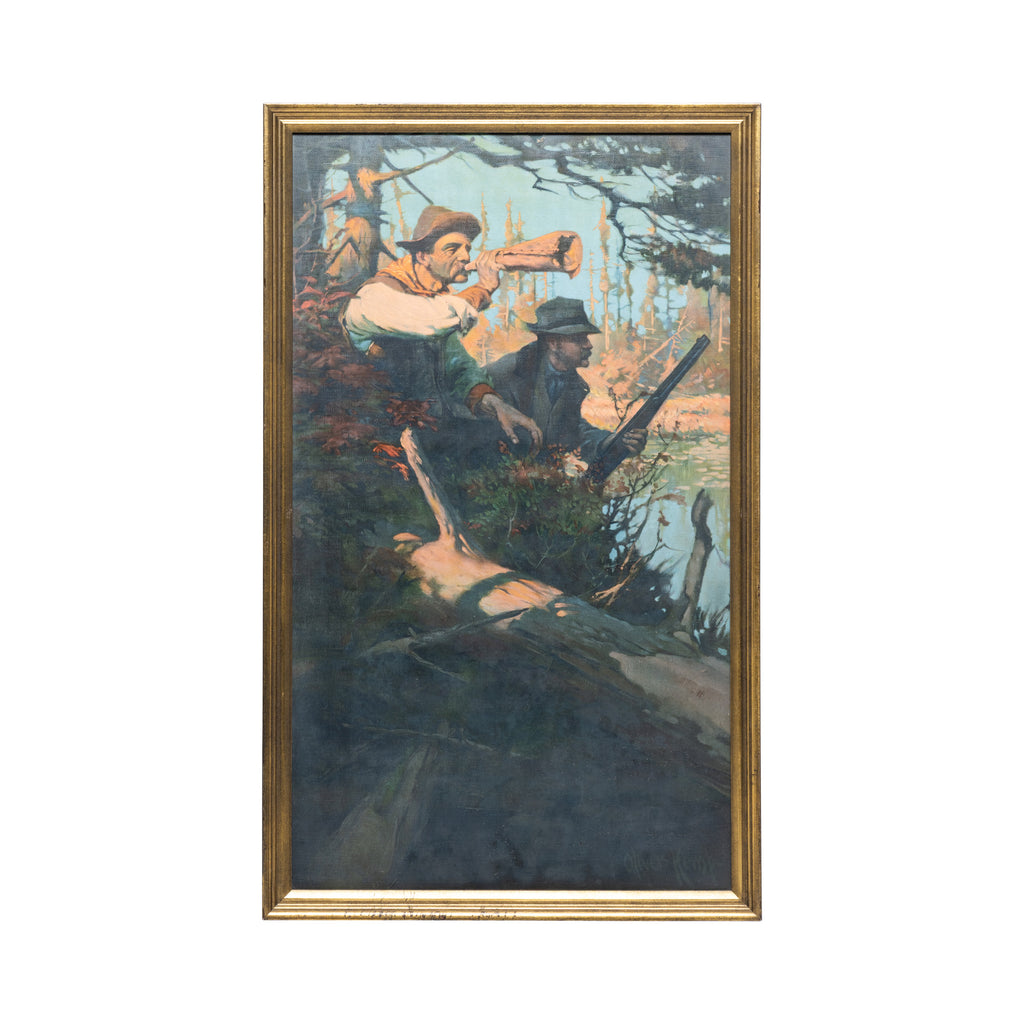 Moose Hunt by Oliver Kemp. Framed chromo lithograph; 16" x 28". Period frame.