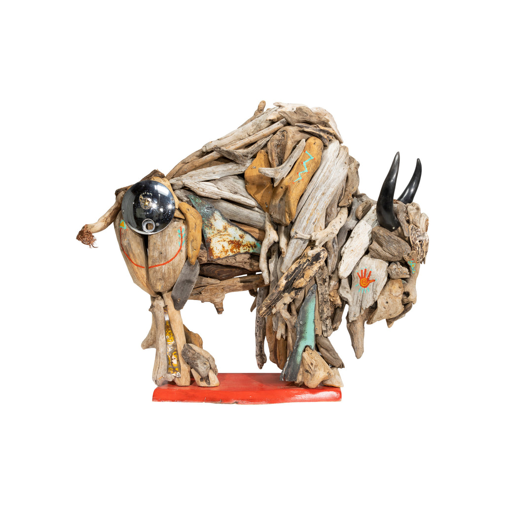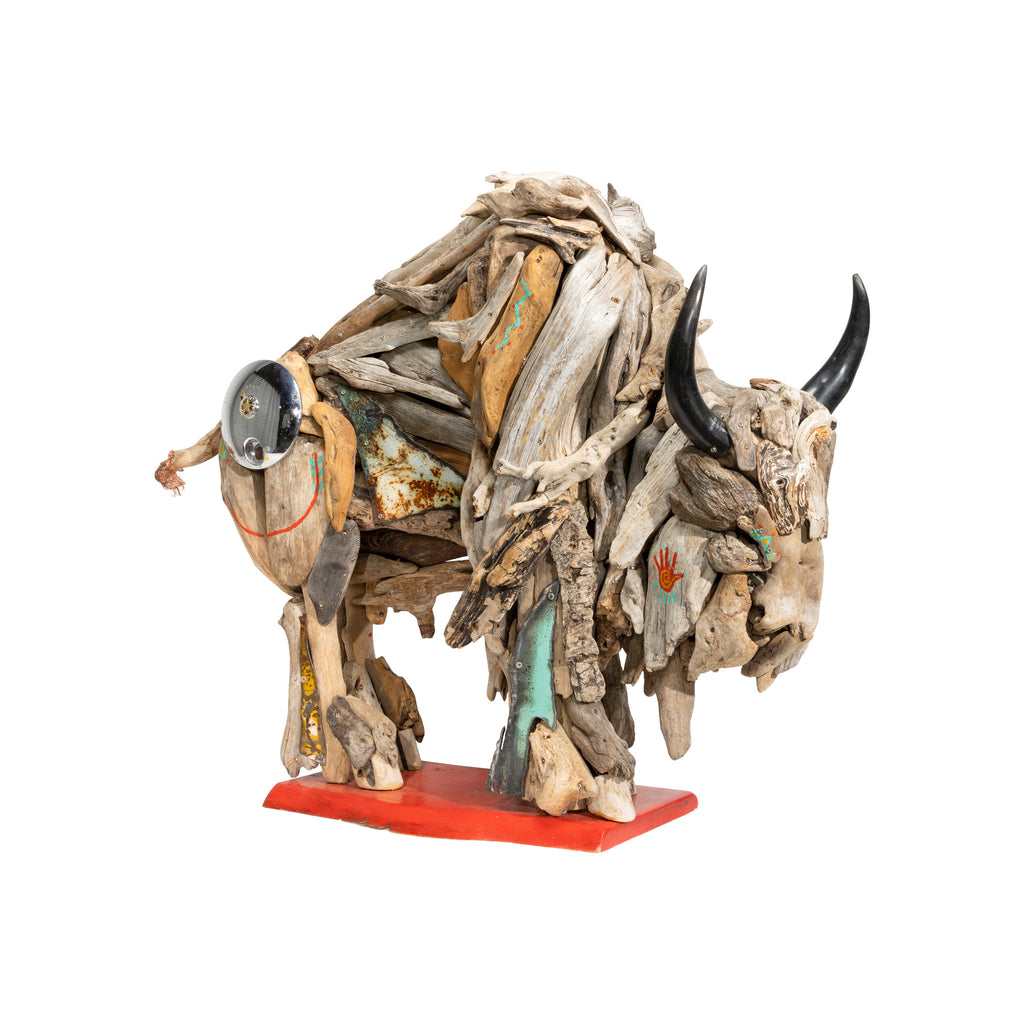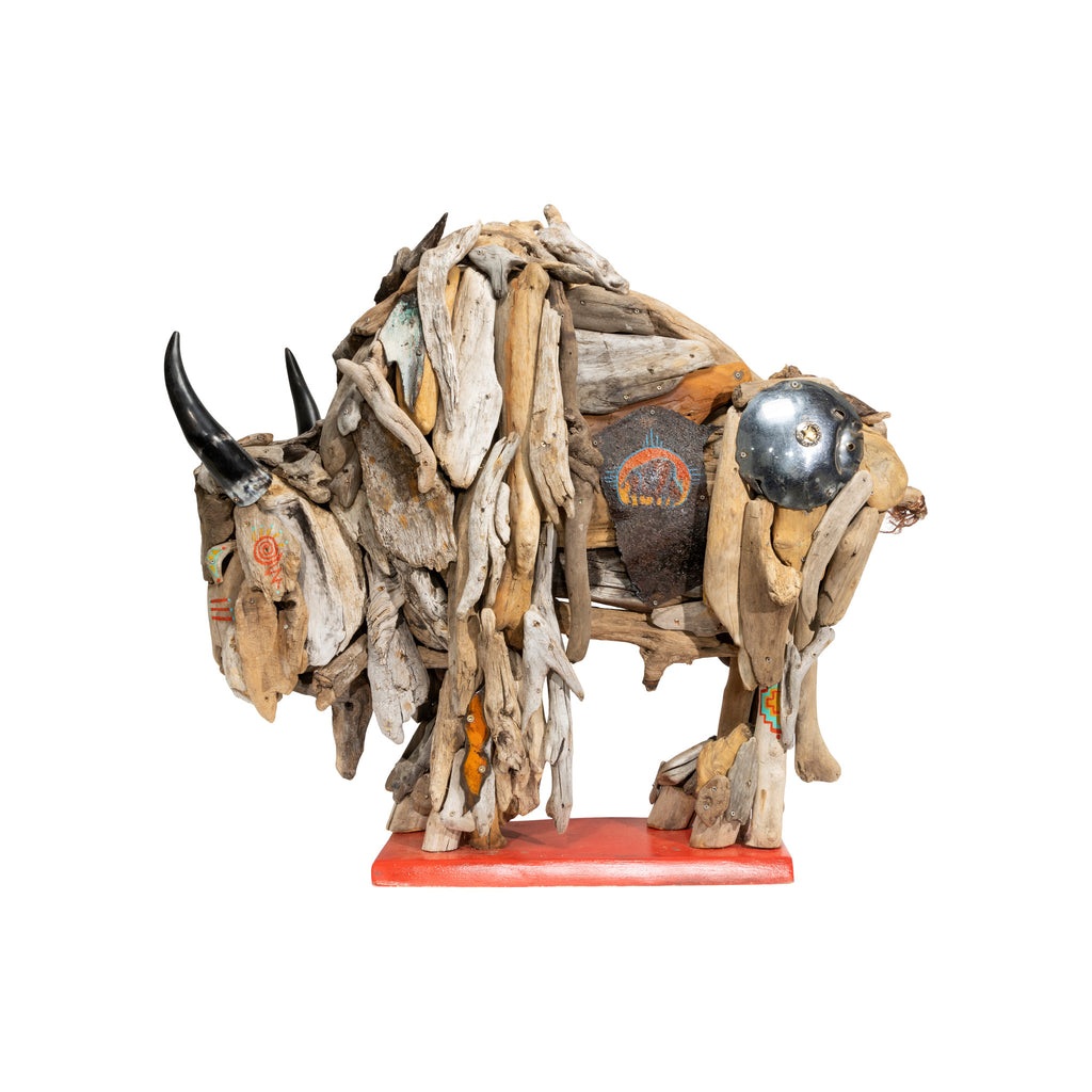 Large driftwood buffalo. Natural ends with scrap yard steel by a Montana artist. 37” x 29” x 11”