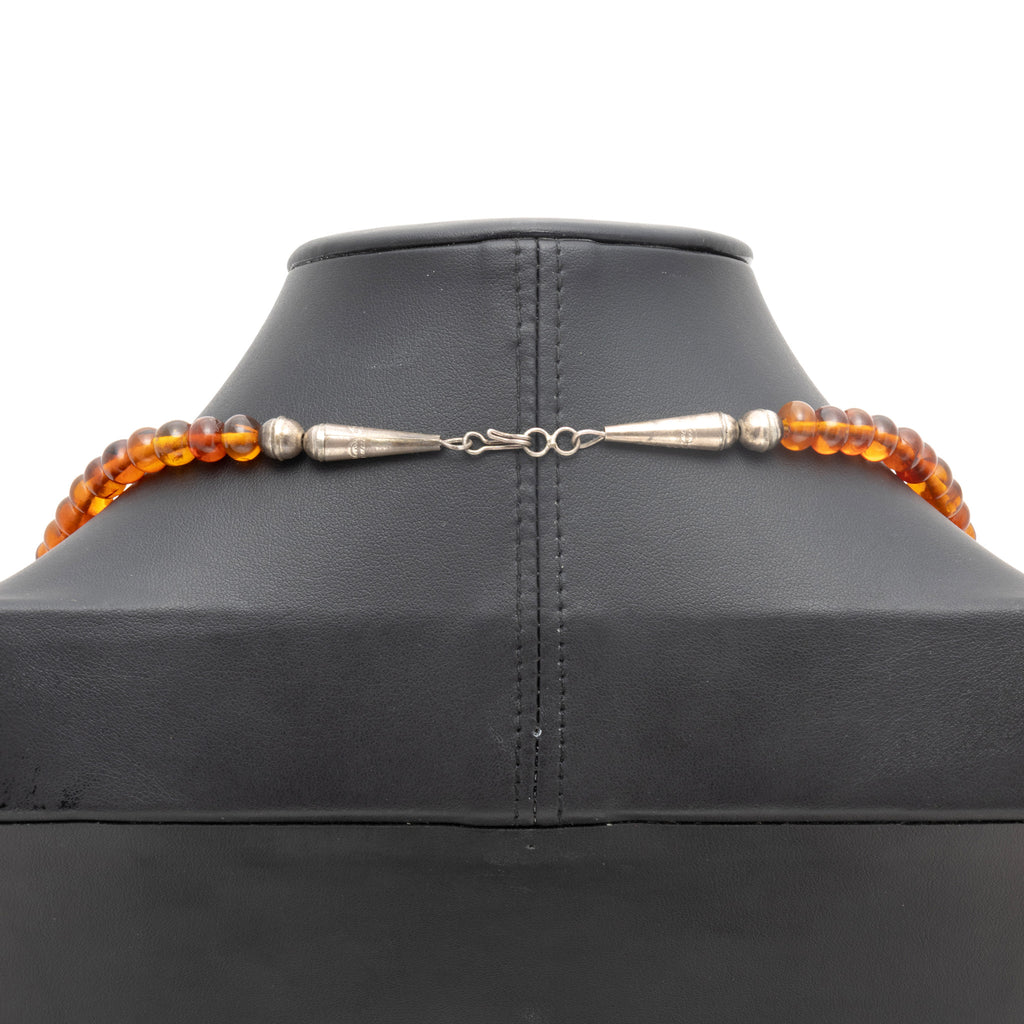 Navajo amber and lapis beaded necklace. Even round beaded balls of amber interspersed with smaller beaded balls of genuine dark blue lapis. Sterling silver beaded and eye clasp closure with hand stamped palmettes and maker's mark. 34"L