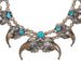 Navajo bear claw necklace with 8 claws each tipped with a sterling silver point. Scrolled leaf and flower design, each having an exceptional nugget of Sleeping Beauty turquoise. Hand stamped sterling silver beads. Marked on back "Gomez Sterling" with pictorial.