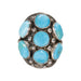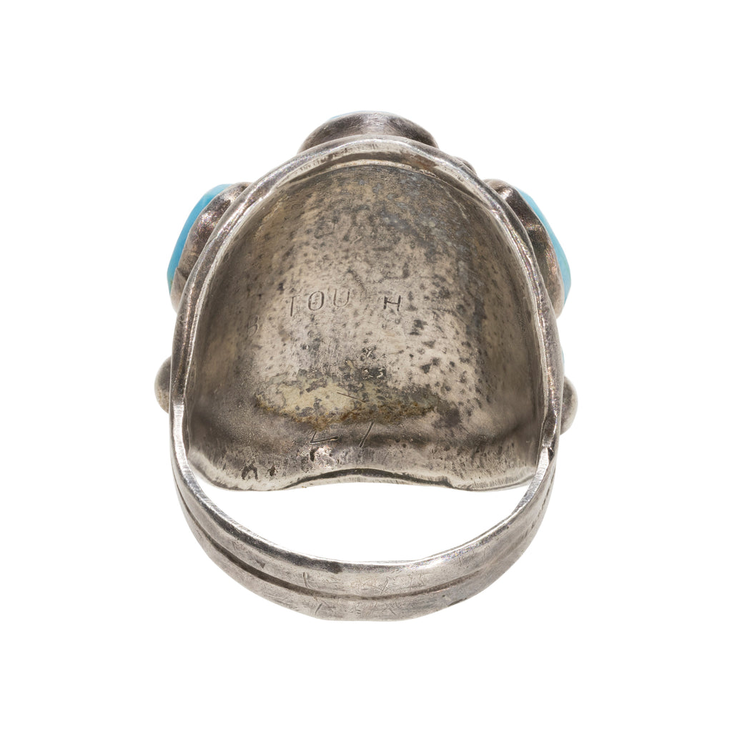 Navajo Bisbee turquoise and sterling ring. Seven turquoise nuggests interspersed with sterling beads surrounded by hand stamped detail. Maker's mark "B. Touchine", semi-worn off from wearing.
