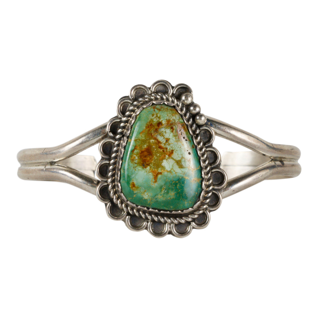 Beautiful green speckled turquoise nugget from the Blue Diamond mine, surrounded withsterling silver loops and twisted rope. Marked "W. Begay" (Wilford Begay) and sterling on back.