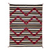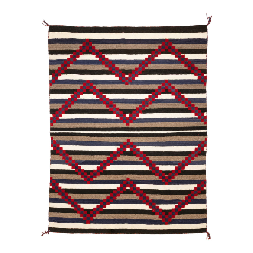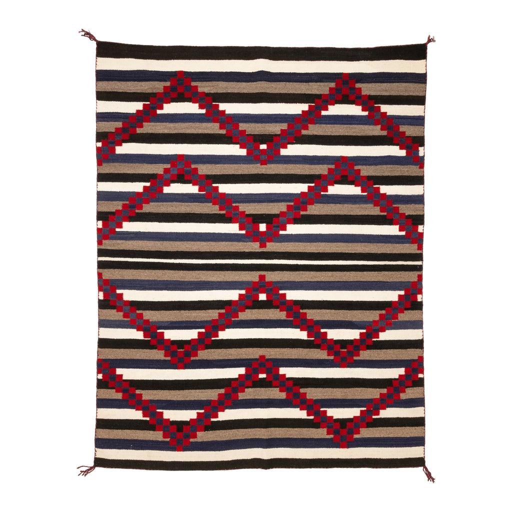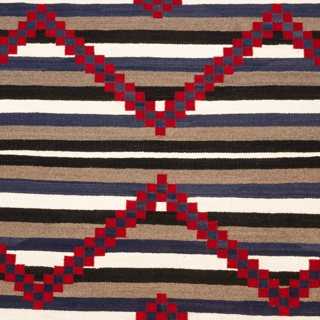 Navajo Chief blanket style floor weaving. Oversized. Stripes, squares, with white, black and blue colors. Est. 1940's. 6'1" x 7'9"