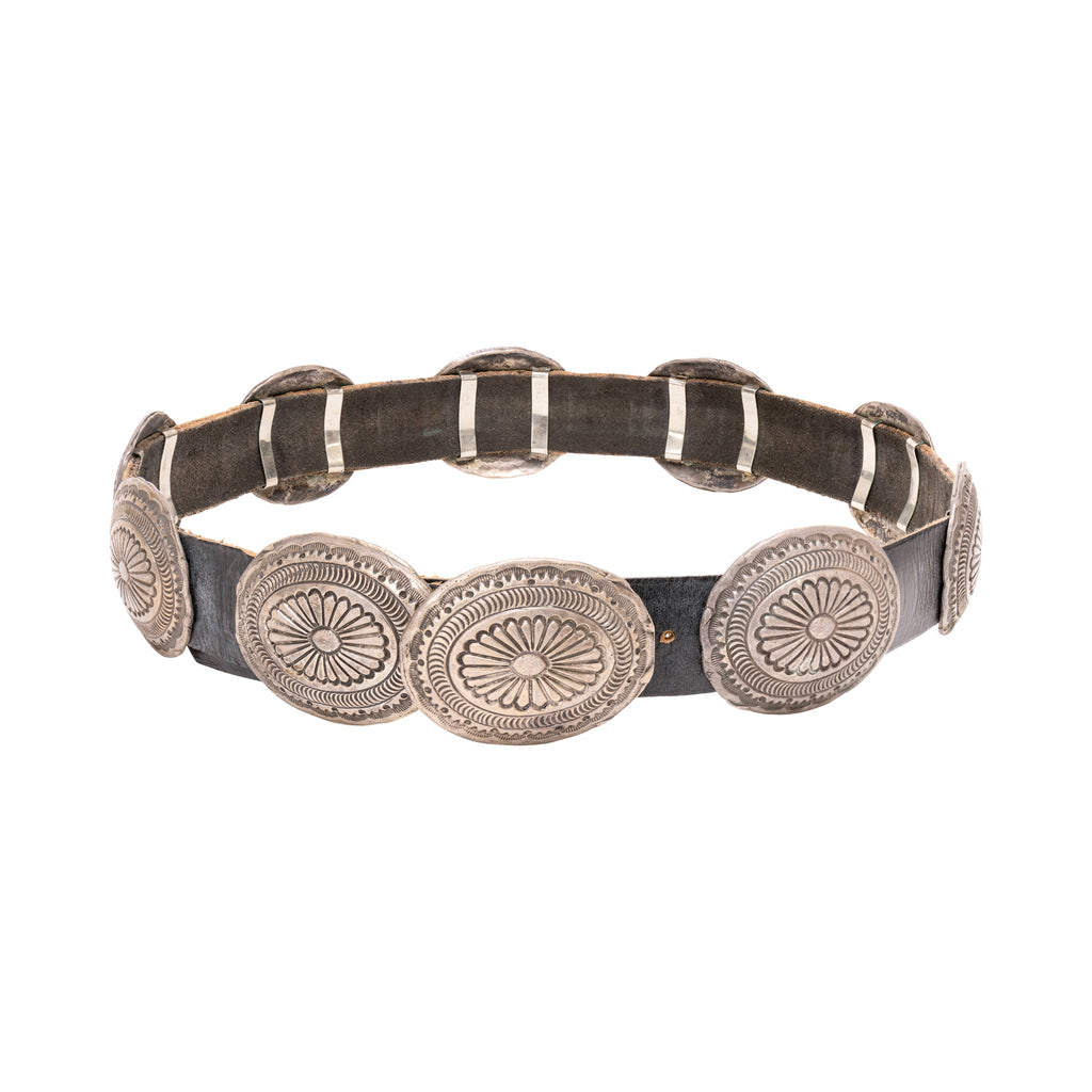 The word “concho” sometimes spelled “concha”, comes from the Spanish word meaning shell. Some of the first “conchos” were made of melted silver dollars and resembled a shell. Concho belts reportedly began appearing in Navajo country in the late 1860s. Other Native Americans including Zuni and Hopi also made traditional concho belts before long.