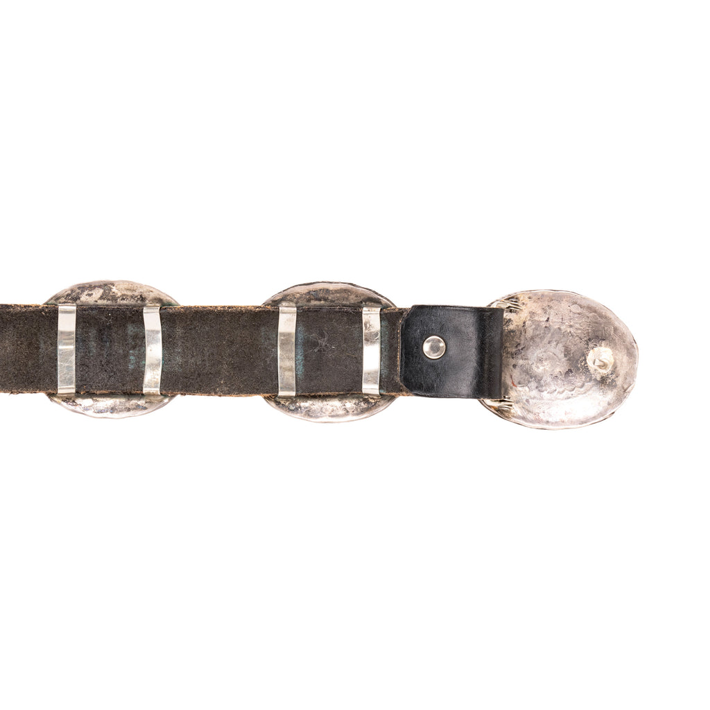 The earliest concho belts are now referred to as “First Phase” belts. This style of belt was made before Native silversmith had learned much about soldering. The conchos were hammered out from melted coins, cut, and filed into shape, engraved and a diamond shape slot was cut out of the middle of the concho, with a bar left across the center of the diamond shaped slot for the leather loop. Conchos that required no soldering are generally thought to be made from 1860-1880.