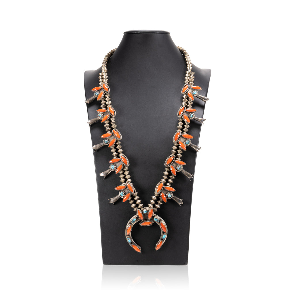 Navajo squash blossom necklace with coral and turquoise. The turquoise is from the Kingman Mine in Arizona. The Navajo word for the squash blossom bead literally means “bead that spreads out”. This tri-petal form first appeared about 1880. Scholars believ
