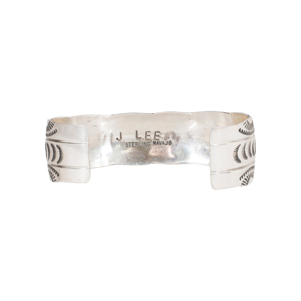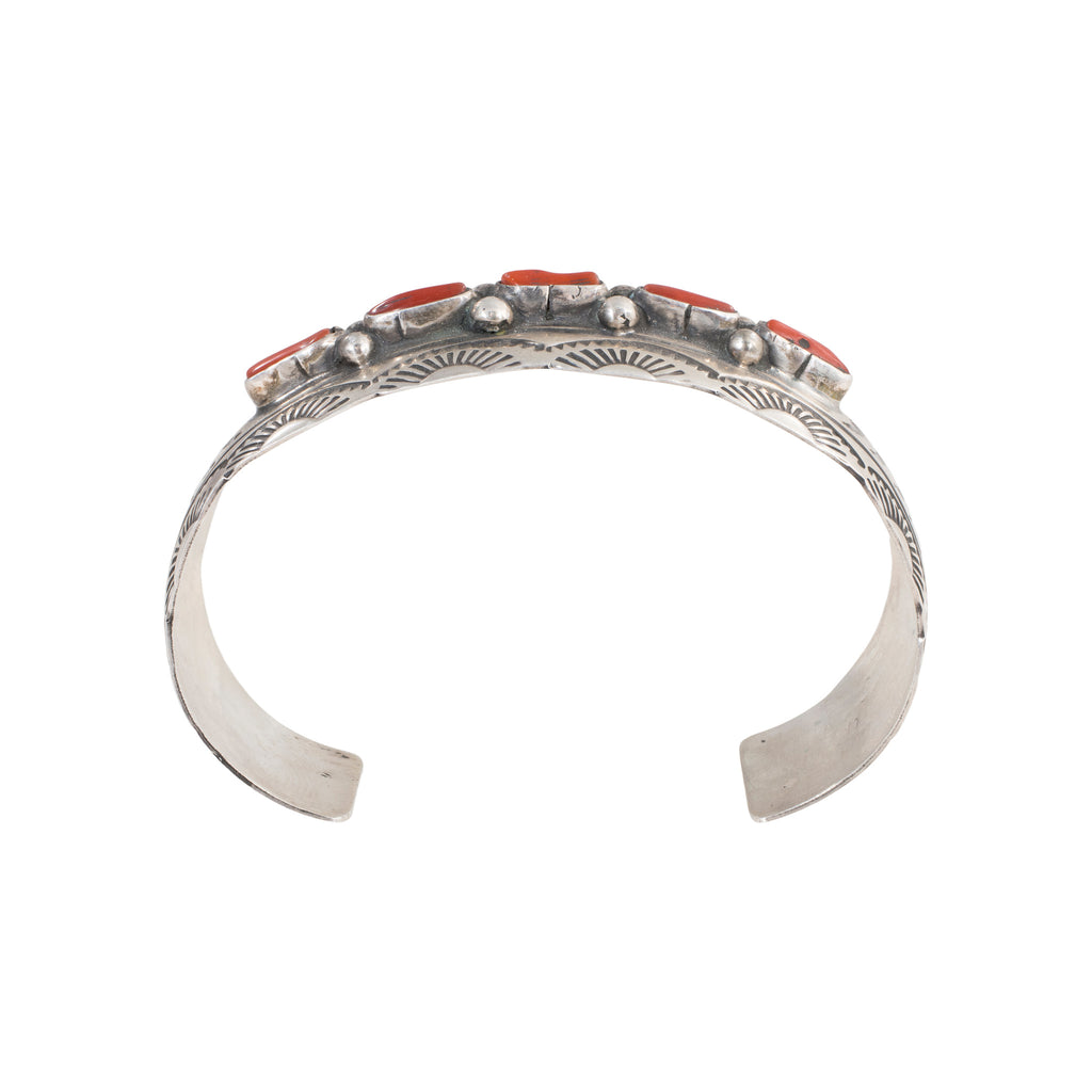 Navajo sterling silver and coral cuff bracelet by J. Lee. This bracelet has five natural coral pieces across the center top portion. The band is completely hand stamped sterling and signed.