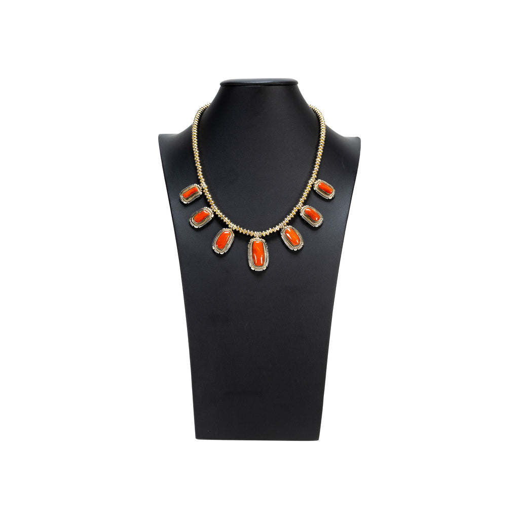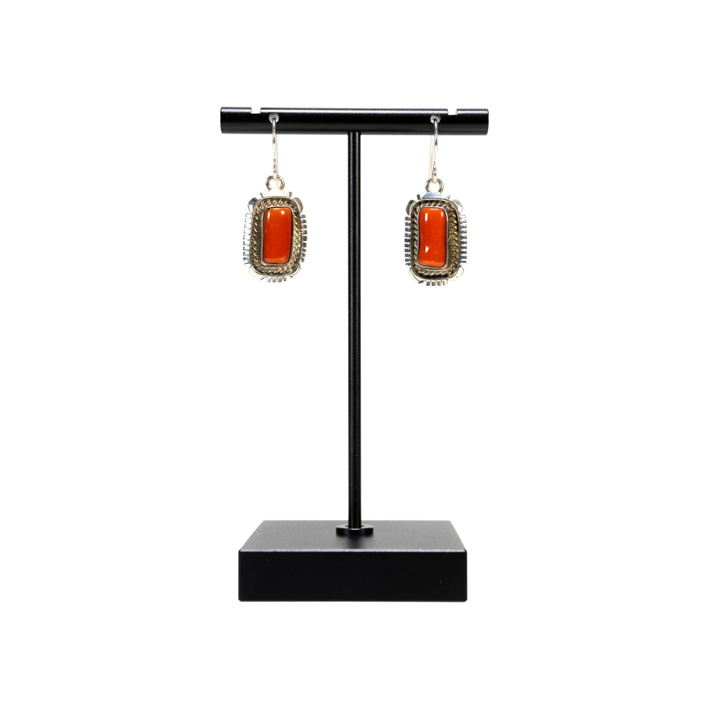 Navajo coral and sterling necklace and earring set by Navajo silversmith Richard Curley. Seven stunning quality coral stones each dangling from a Navajo bead chain surrounded by classic shadowboxed twisted rope and slash designs. Earrings designed in same