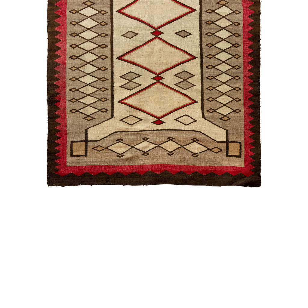 Navajo Crystal with Diamonds and two whirling logs in center. Professionaly Cleaned. Scattered Minor Stains. Edgewear, remains solid. Slight A & B side. Large cabin floor weaving.