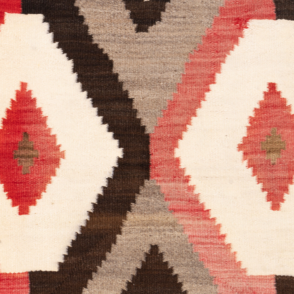 Navajo crystal floor rug with burnished bars on both ends. Interesting variations in the reds. 7'2" x 3'3."