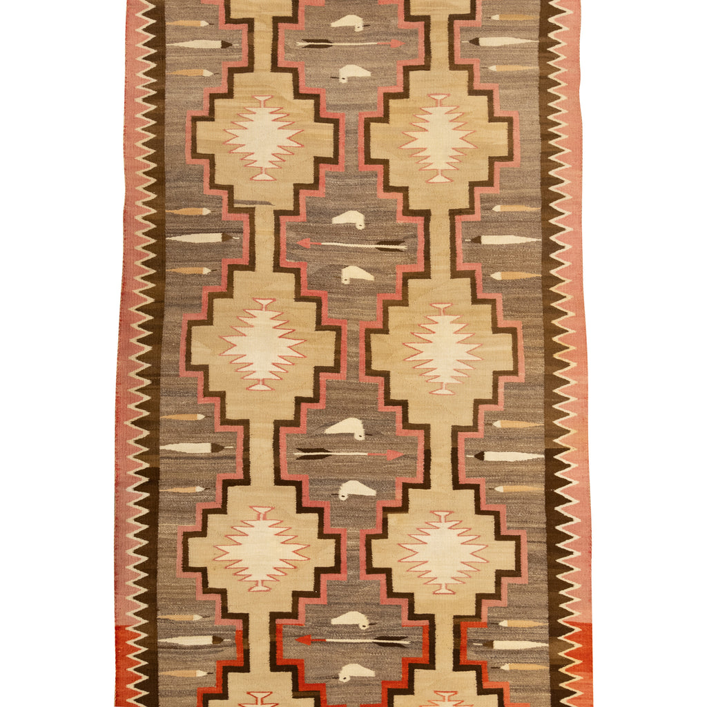 Navajo Crystal runner with birds, bow and arrows and eagle feathers. Several different red dye lots, some fading, both sides the same. 4'4" x 10'10"