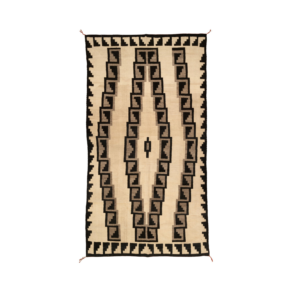 Navajo Pinon weaving in traditional natural whites and grays with original nametag from Anna Mae Tso. Ex. Steve Goldstein. 6' 8" x 13'