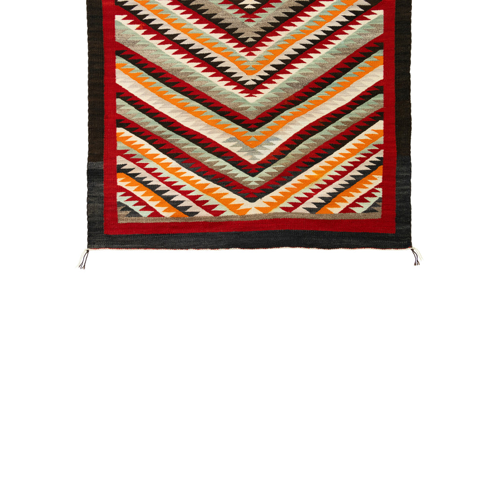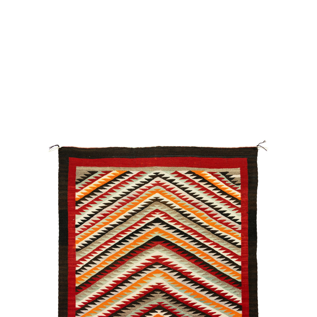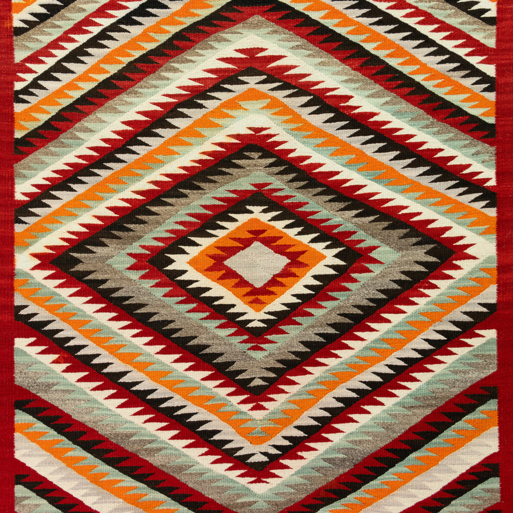 Red Mesa weaving. Geometric shapes with bright colors of orange, red, blacks, tans and browns. Shows little if any use. 3'4" x 5'9"
