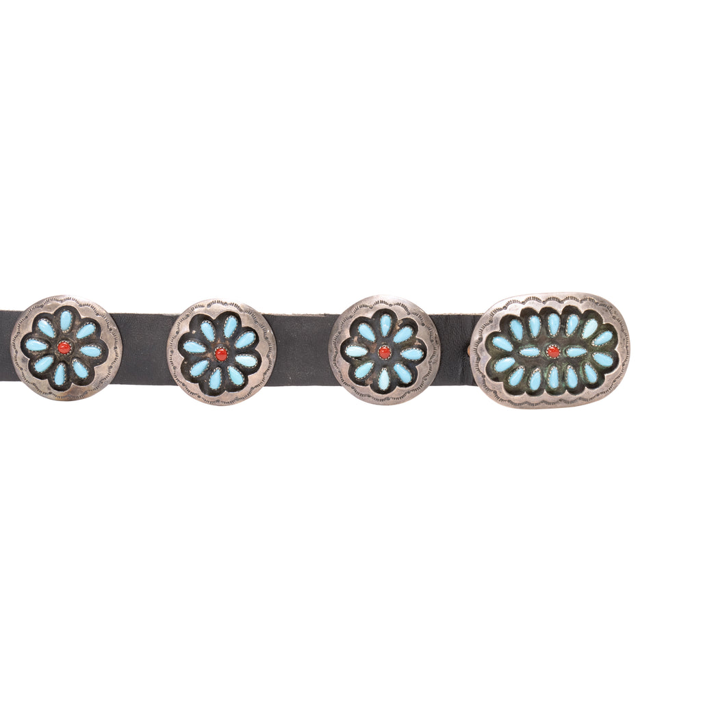Navajo shadowbox concho belt, each concho having a red coral center, surrounded by turquoise tear drops. The turquoise is from the Sleeping Beauty Mine in Arizona. Fourteen conchos total. Purchased from family whose mother purchased on the reservation in the 1970's.