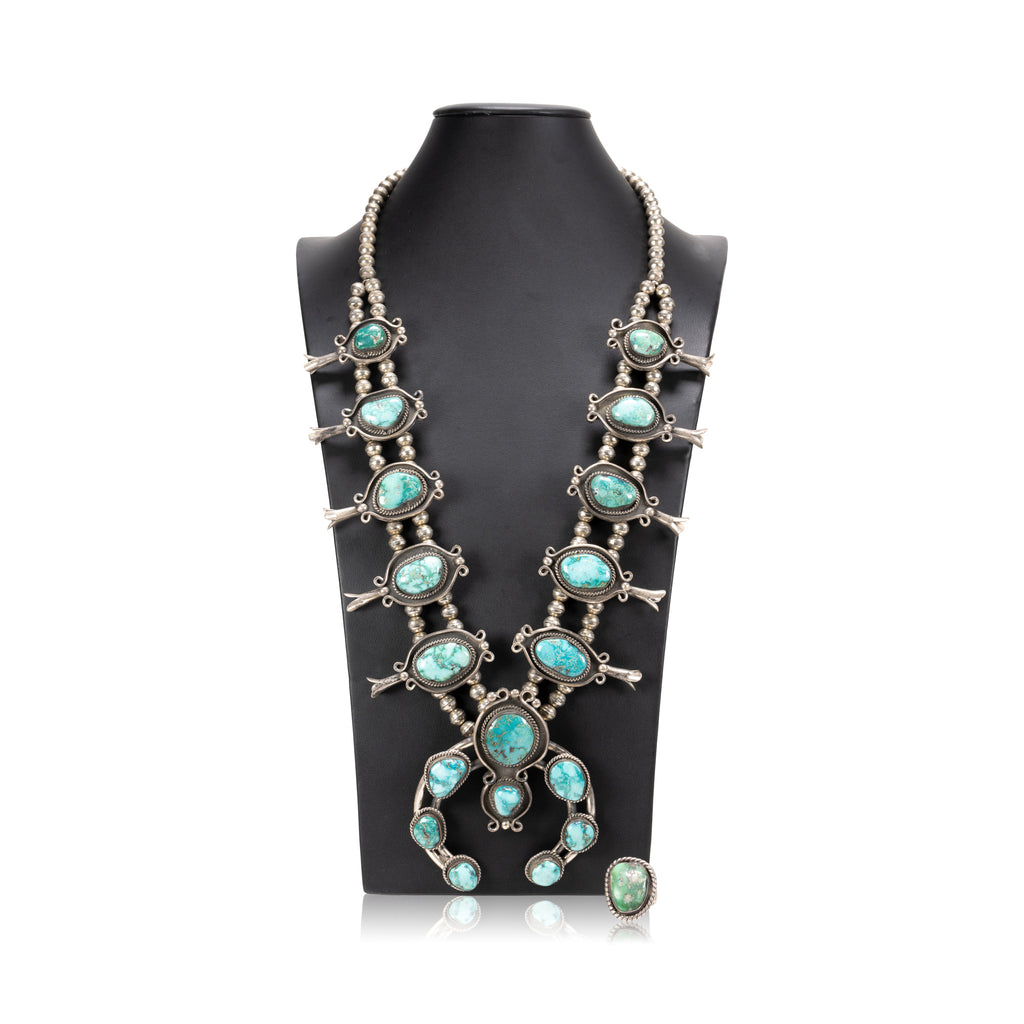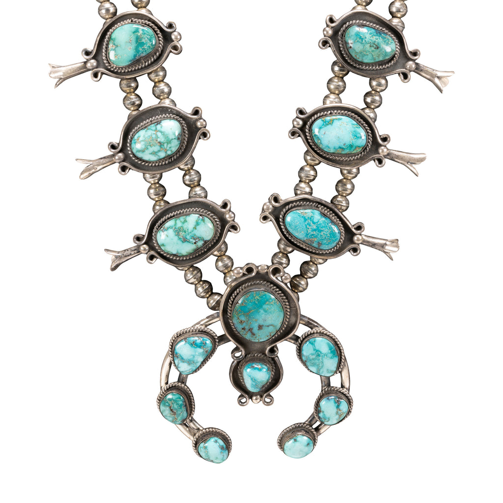 Navajo squash blossom necklace. The turquoise is from the Kingman Mine in Arizona. Eighteen turquoise stones total. Old Pawn. From the Indian Store in Clovis, New Mexico. The Navajo word for the squash blossom bead literally means “bead that spreads out”. This tri-petal form first appeared about 1880. Scholars believe that this flower motif was introduced by the Spanish as a variation of the pomegranate flower blossom, and the Navajo adapted it as a symbol of their revered squash. Initially the necklaces were rather simple with the tri-petal silver beads interspersed with rather plain beads. In time, stones were added to the blossom beads as demonstrated in our collection. According to the Navajo, the Naja is strictly decorative; however, it has always been held in high regard by the Navajo and other peoples.