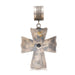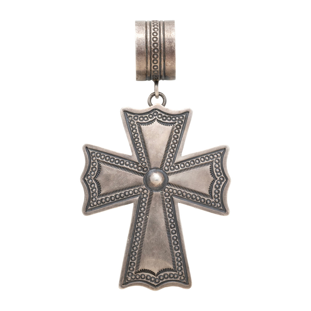 Navajo sterling silver cross pendant. Classic slash mark and palmette design with nice patina. Stamped Sterling with maker's mark on back. Large loop for hanging. 3 1/2" x 2", 24.80 grams