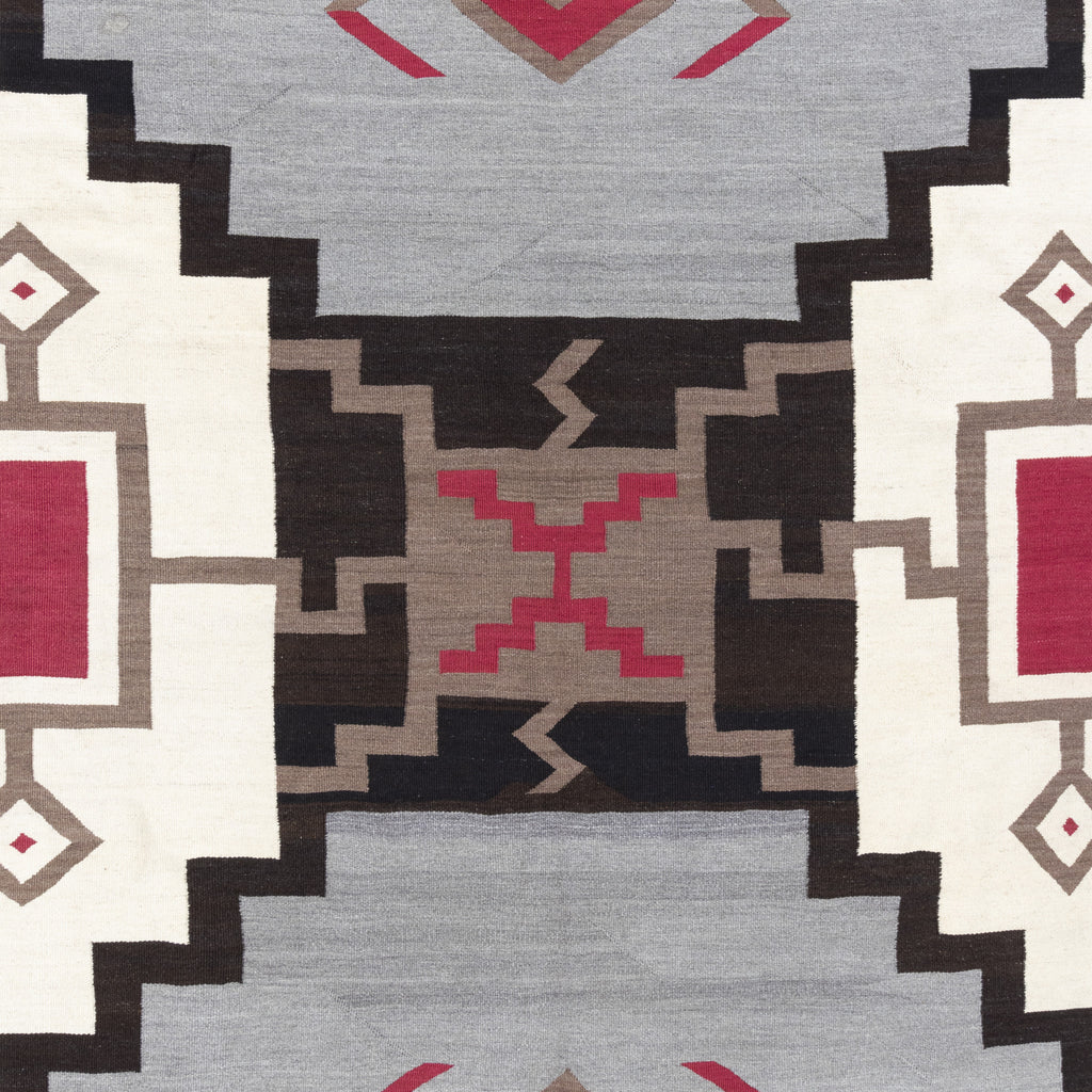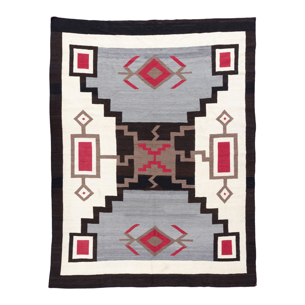 Large Navajo Storm area pattern weaving with water bugs on both ends. 7'11" x 10'3."