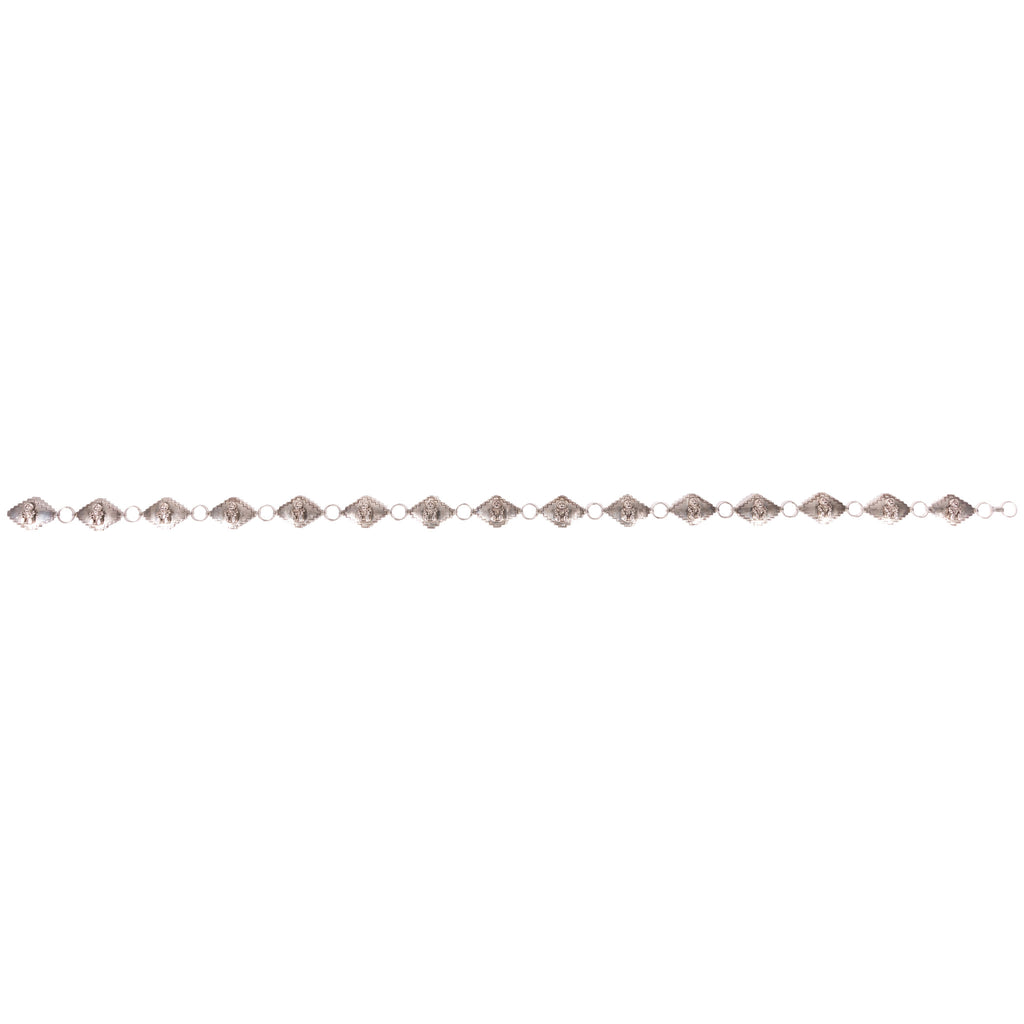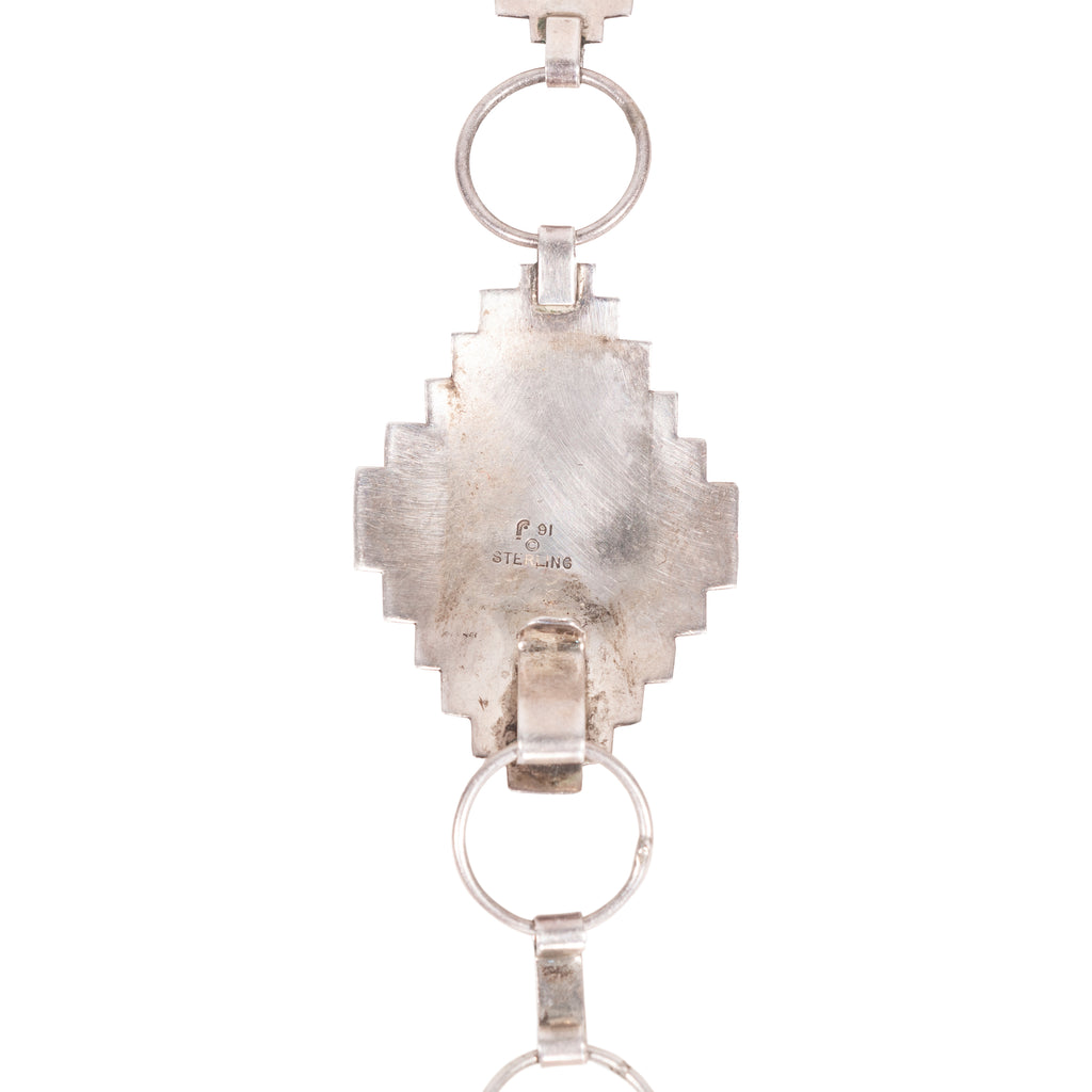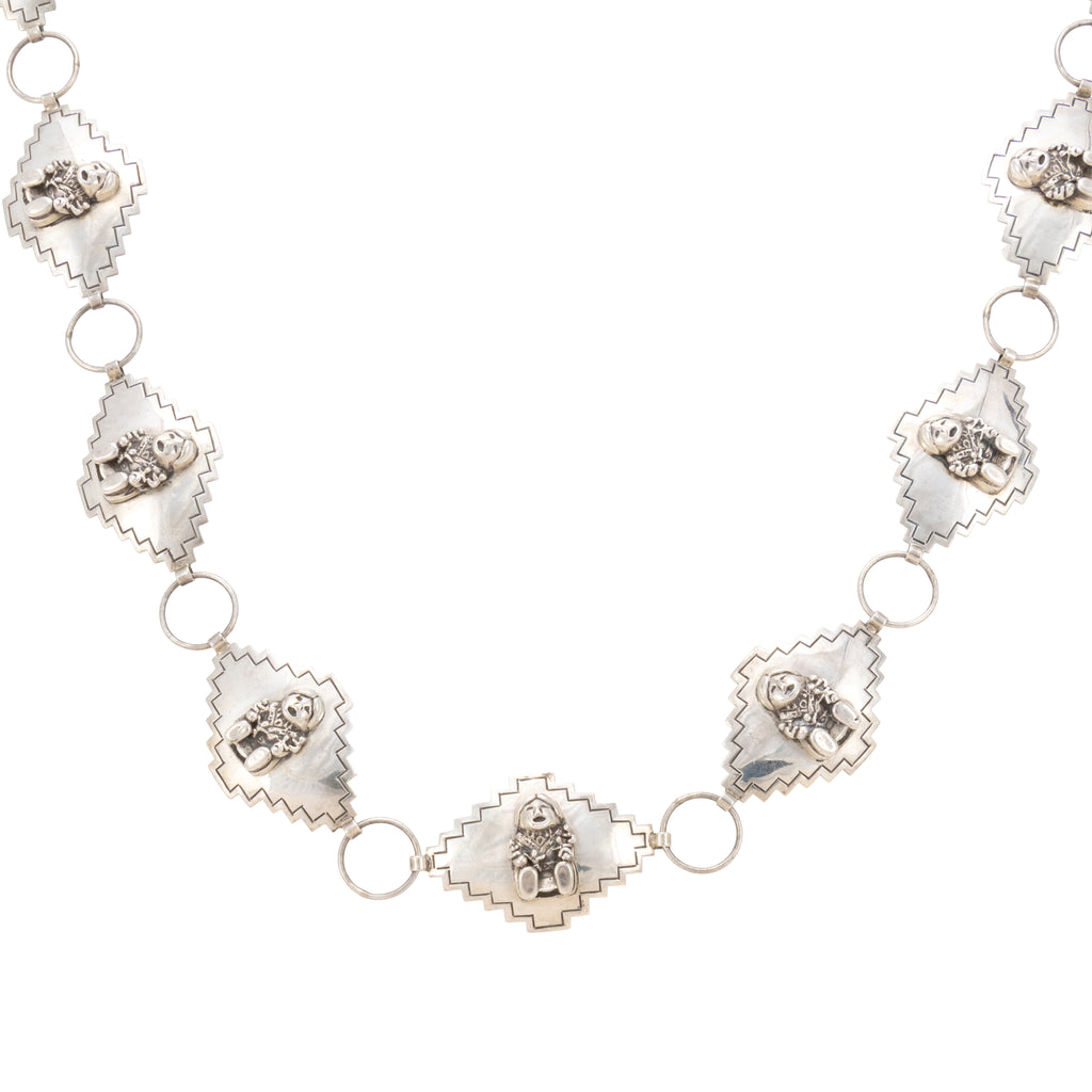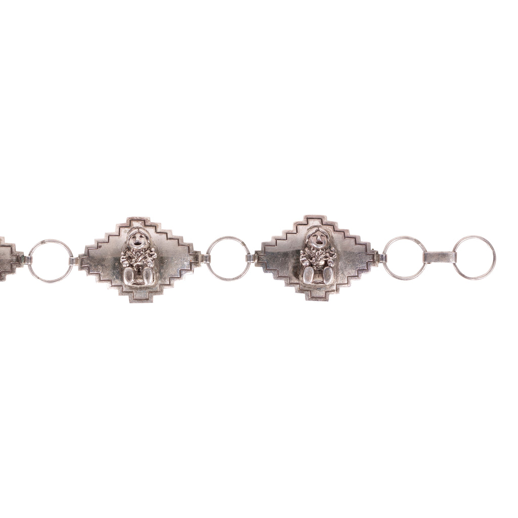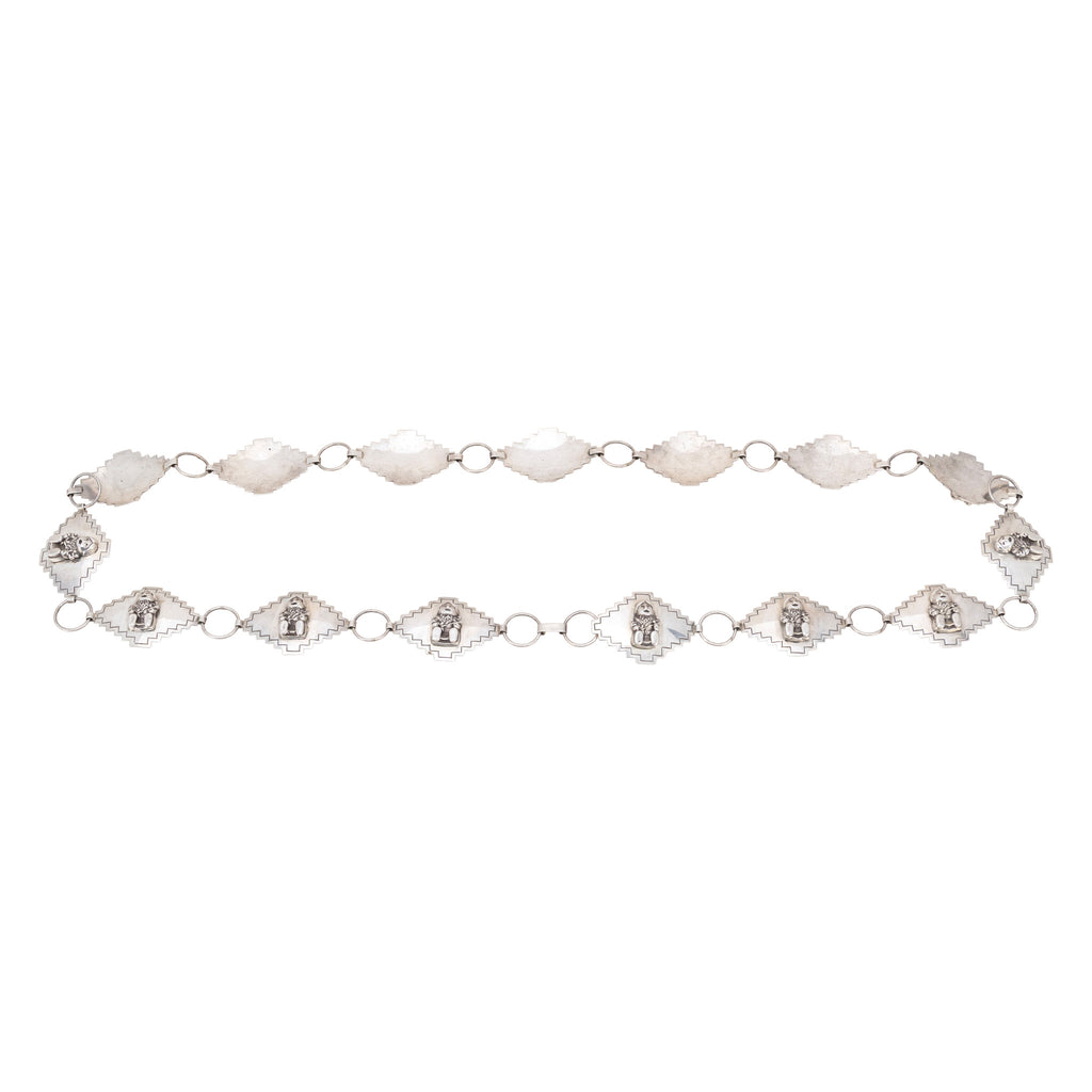 Unique silver concho belt with storyteller figures on each medallion. Marked sterling with copyright and pictorial mark, 91.