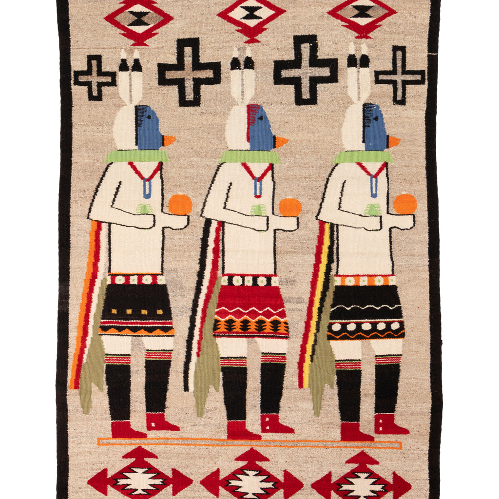 Navajo three figure Yei; all differently designed skirts and sashes, concho belts, rattles, crosses, with stylized fox skin drops for the Snake Dance; exceptional wall hanging. These weavings come from the Shiprock (Winged Rock) New Mexico, and the Lukachukai, Arizona areas. Yei means holy being or spirit in Navajo. The traders in Lukachukai, Arizona and Shiprock, New Mexico encouraged the weavings of figural rugs during this period. The Yei Bi Chei are also called Grandfather Spirits and are the focus of healing ceremonies. During these ceremonies the dancers take on the role of intermediaries between the Gods and the Native People. 38” x 58”