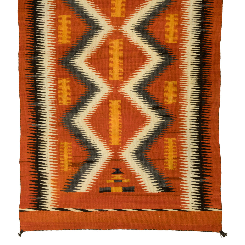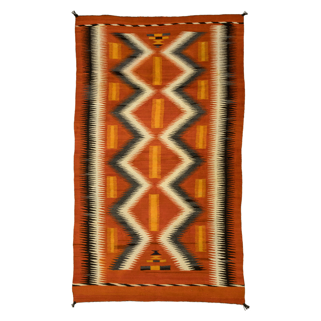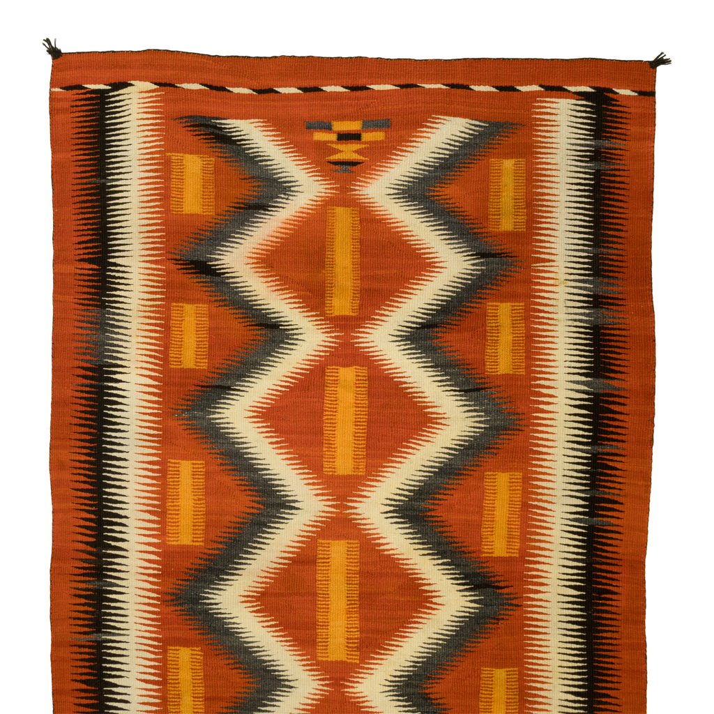Very vibrant Navajo transitional blanket with lightning, herringbone and weaving comb designs. Candy stripes on both ends. Hand dyed. Soft merino wool. 4'7" x 6'11"