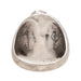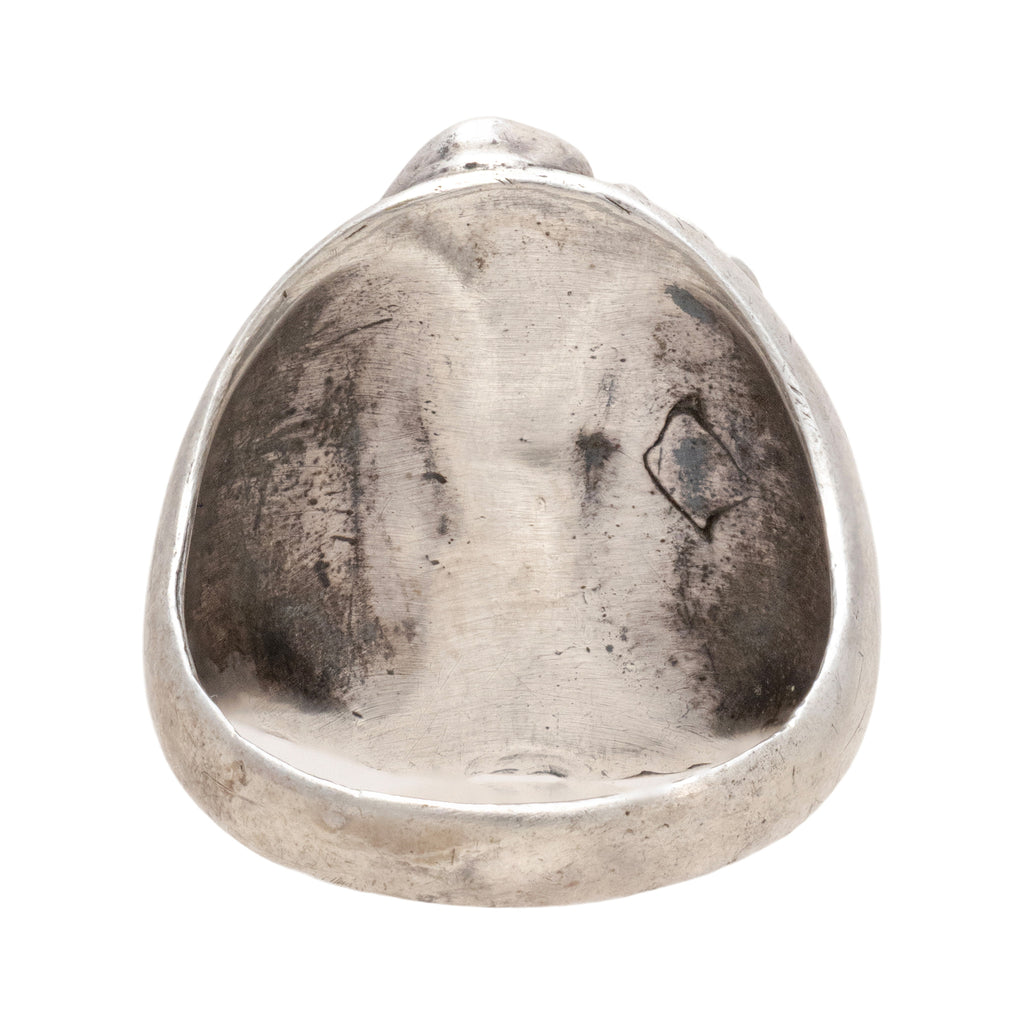 Navajo Kingman turquoise, coral and sterling silver men's ring. Raised natural, untreated stones with sterling silver floral and bead motif. Maker's stamp on inside of band. Size 12, 12.33 grams