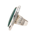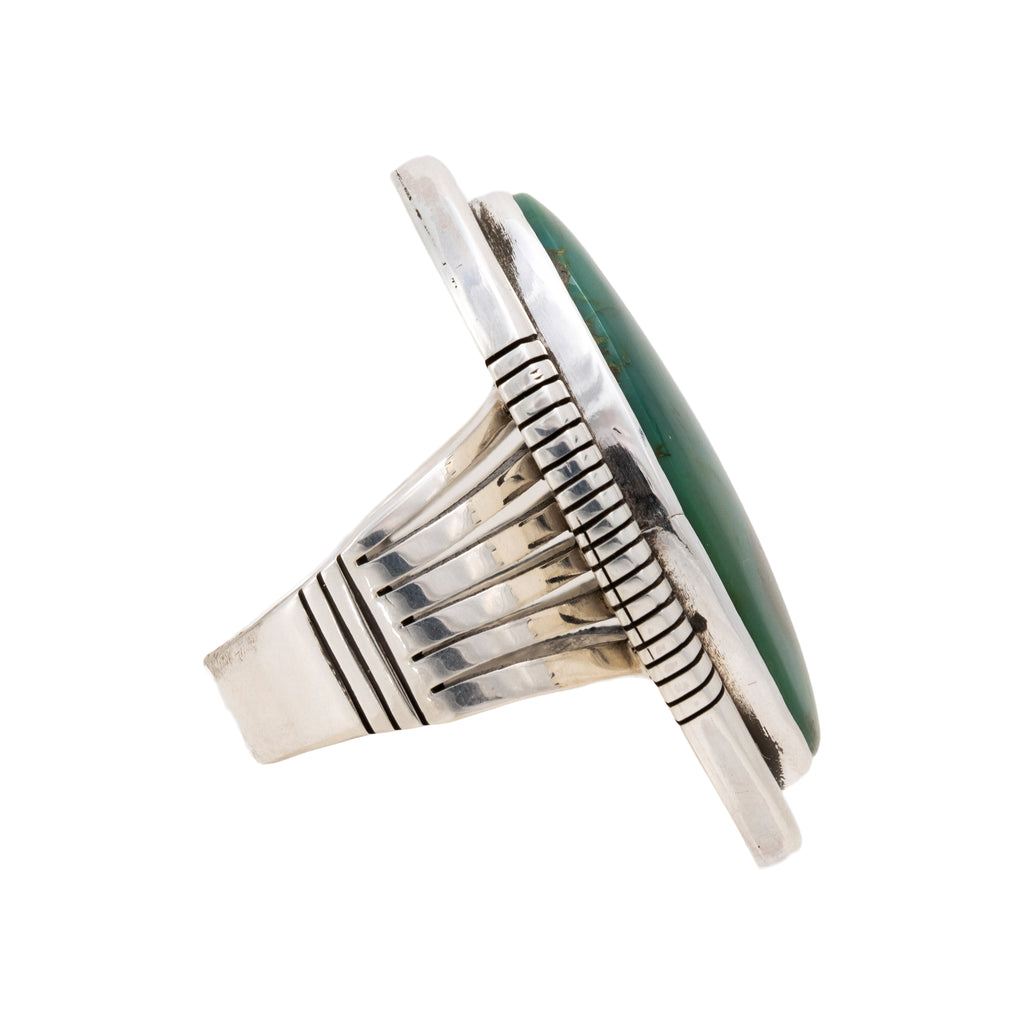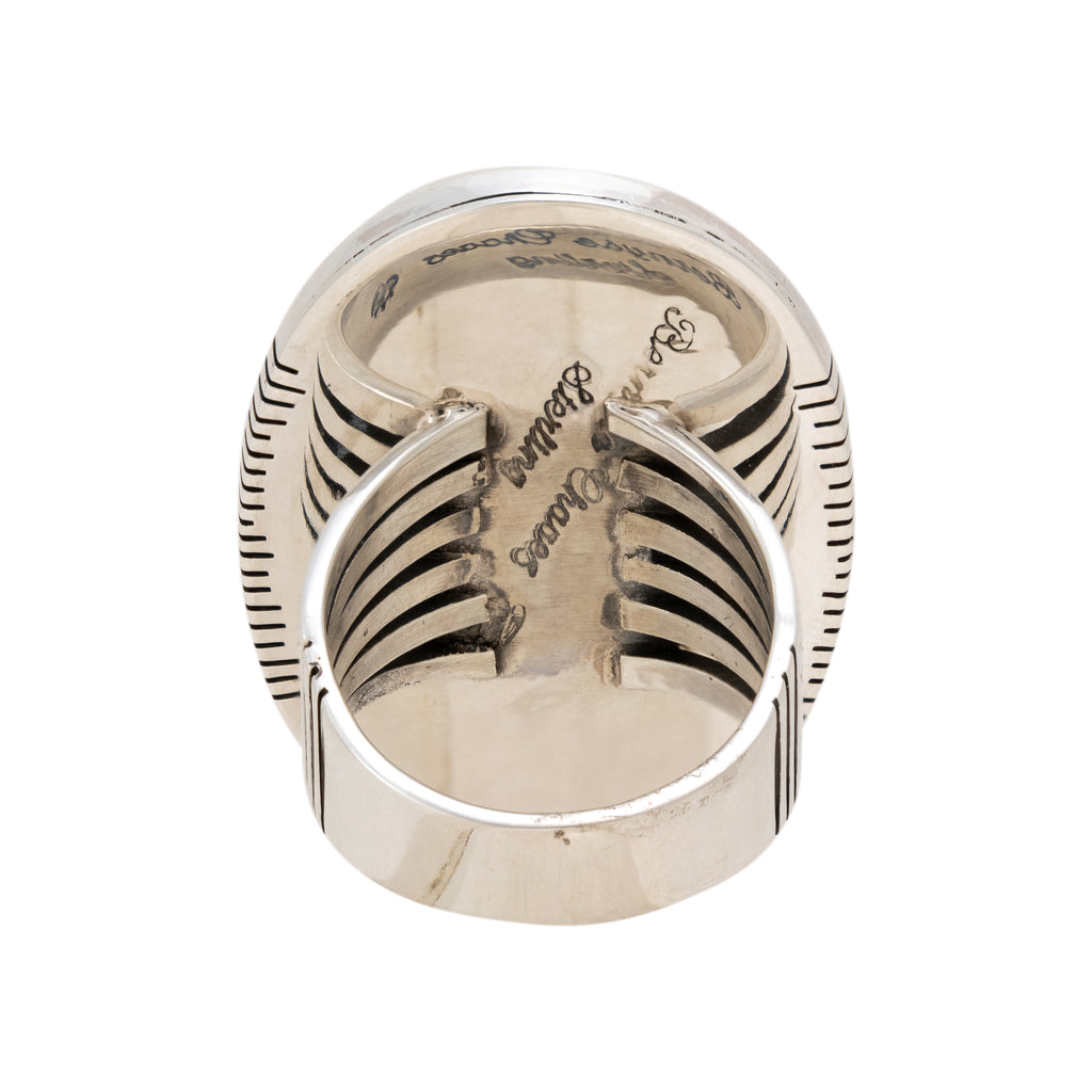 Navajo Royston turquoise and sterling ring by Navajo silversmith Bernyse Chavez. Exceptionally dark and deep stone set in polished sterling silver with simple hashmark designs. Stamped "sterling" and maker marked "Bernyse Chavez" on inside of band.