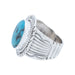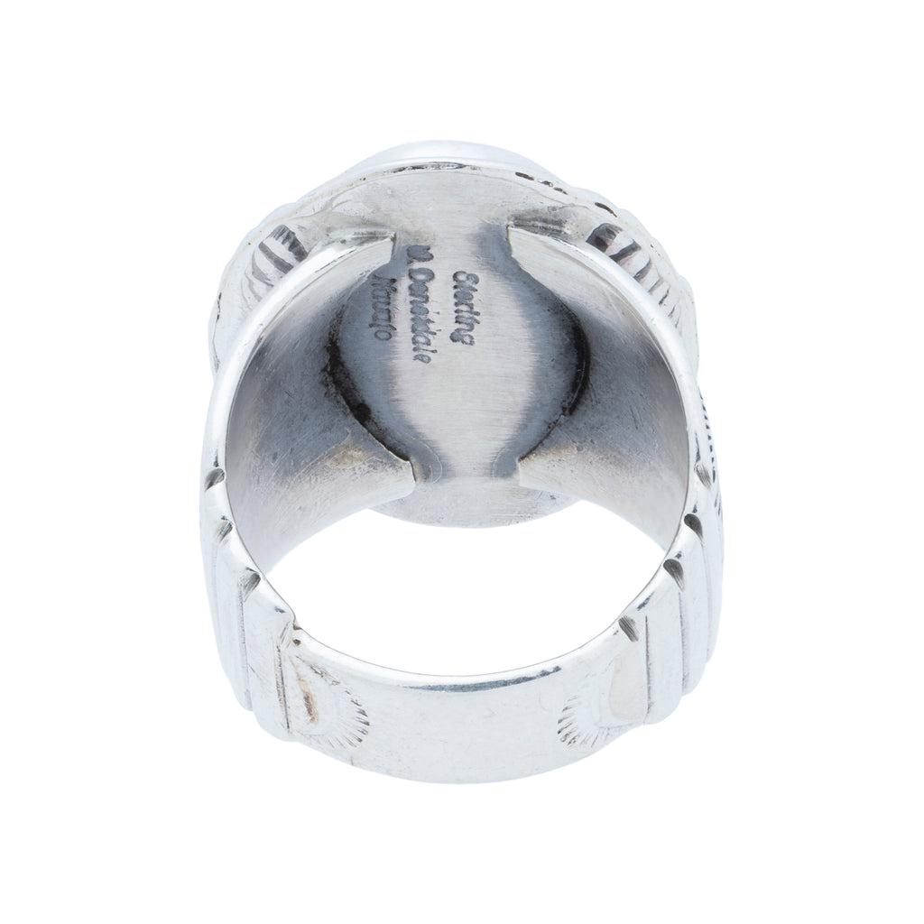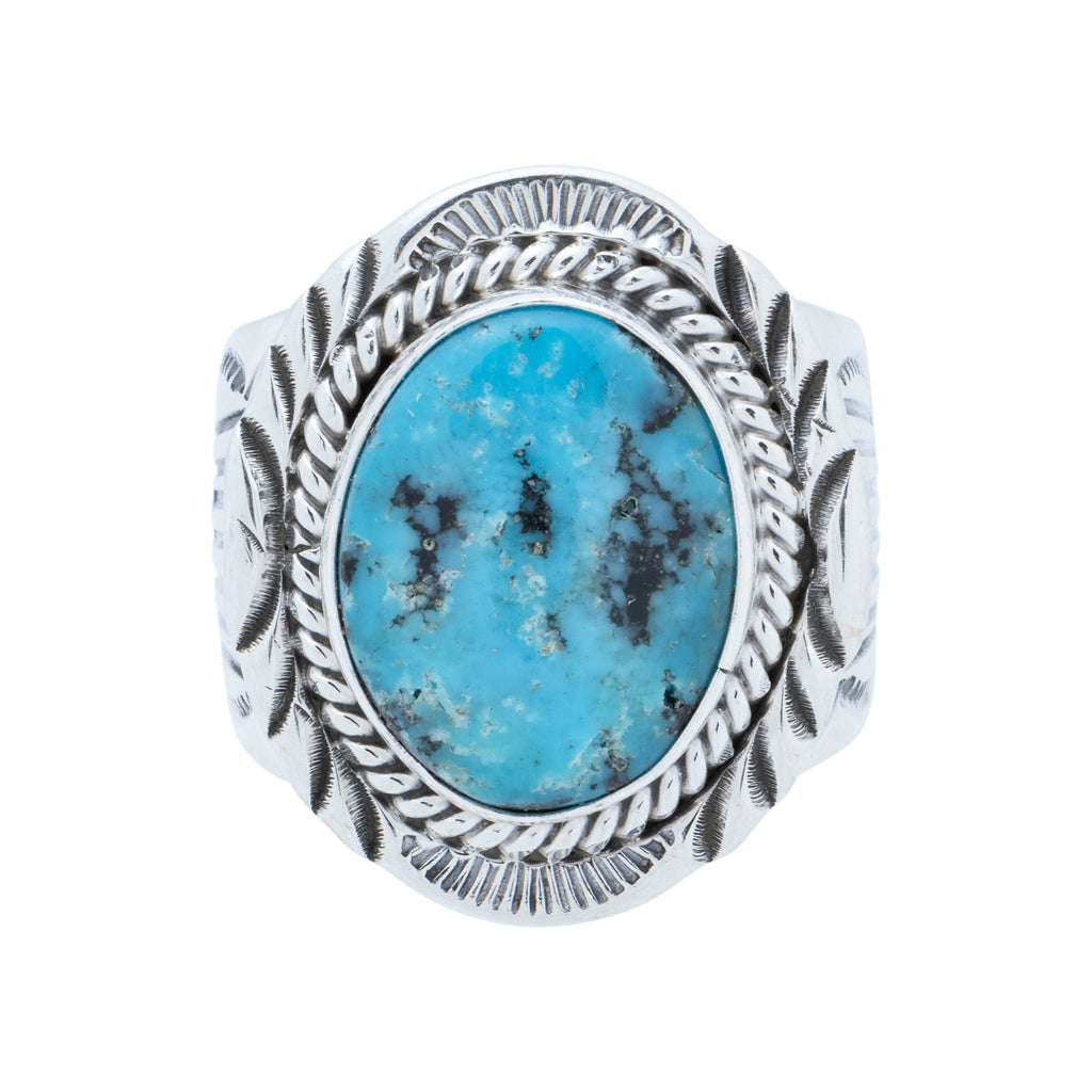 Navajo sterling silver and Kingman turquoise ring. Natural, untreated stone atop a classic twisted rope border with slash marks and hand stamped palmettes that flow through the thick band. Made by Navajo Silversmith W. Will Denetdale and stamped "Sterling", "W. Denetdale" and "Navajo" on the inside. Will resides in Southern Arizona and spends most of his time making jewelry and traveling to shows. His name is becoming famous in his trade; his art a standard by which other pieces may be judged. Will's success as an artist is proportionate to his devotion, and Will Denetdale lives to make jewelry. Finely detailed, Will's work shows an excellent finish. He has a balance and harmony that sets his work apart from other artists. Will studies art and often mixes contemporary motifs with traditional ones. He is constantly striving to improve his technique and takes immense pride in his work, ambitiously trying to make each new piece better than the last.