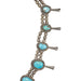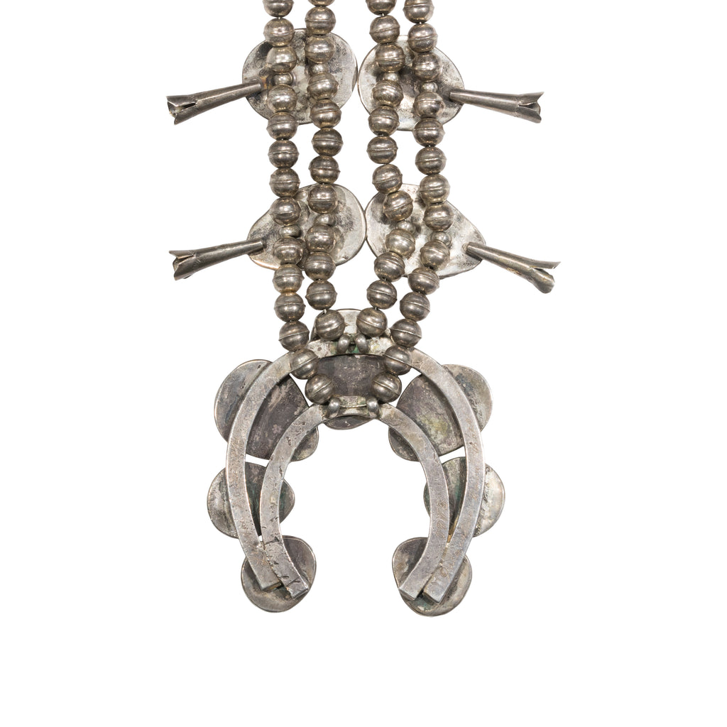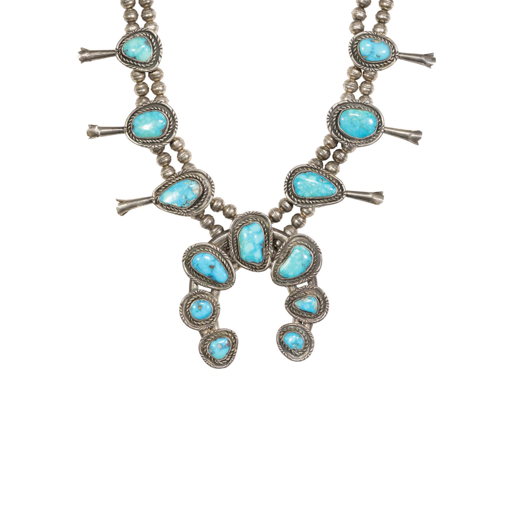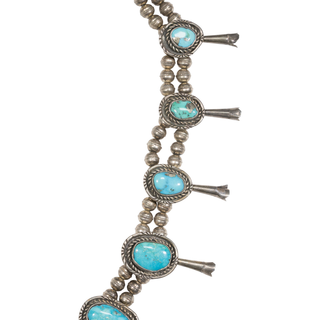 Navajo Kingman turquoise and sterling squash blossom necklace. Ten petals with approx. 1" turquoise stones surrounded by classic twisted rope borders plus a seven stone naja. Old Pawn. Acquired from an individual whose family purchased directly on the reservation.