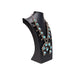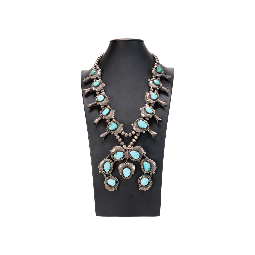 Large squash blossom necklace with 17 Kings Manassa turquoise nuggets and silver leaf setting. Old Pawn. Acquired from an indvidual who purchased directly on the reservation. The Navajo word for the squash blossom bead literally means “bead that spreads out”. This tri-petal form first appeared about 1880. Scholars believe that this flower motif was introduced by the Spanish as a variation of the pomegranate flower blossom, and the Navajo adapted it as a symbol of their revered squash. Initially the necklaces were rather simple with the tri-petal silver beads interspersed with rather plain beads. In time, stones were added to the blossom beads as demonstrated in our collection. According to the Navajo, the Naja is strictly decorative; however, it has always been held in high regard by the Navajo and other peoples.