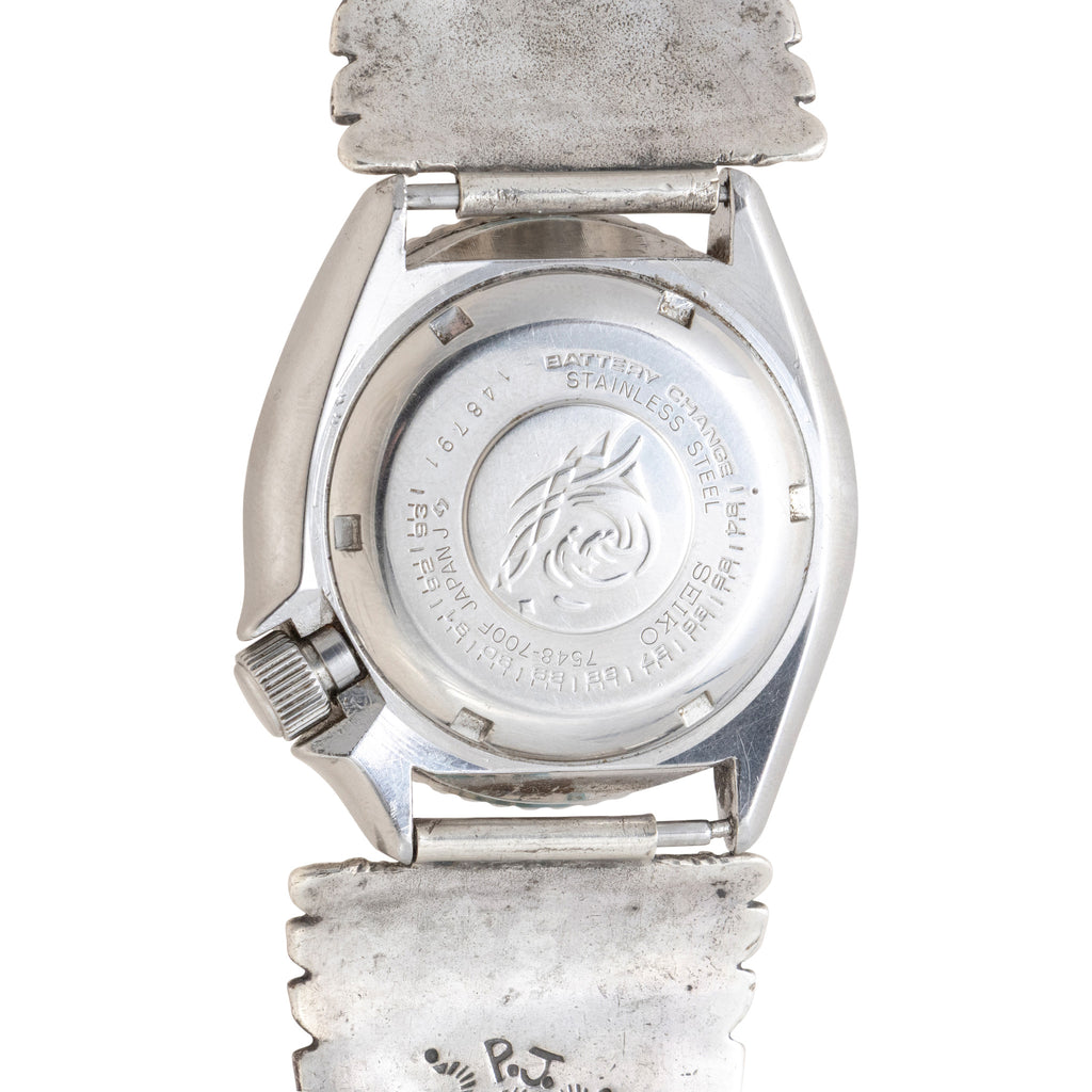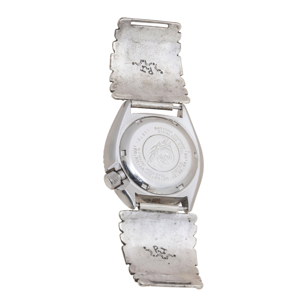Navajo sterling silver and Kingman turquoise watchband with watch. Classic leaf, beads, scrolls and twisted rope set in a shadow box design. Great patina that shows age. Maker's initials "PJ" on band. 45.87 grams, 4 1/2"