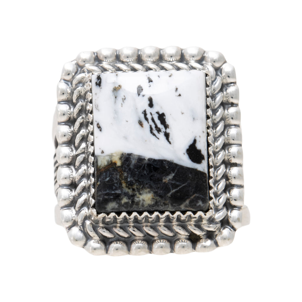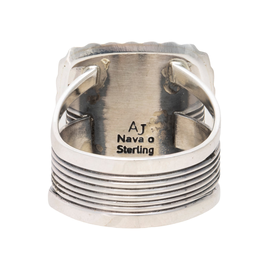 Navajo sterling silver and White Buffalo turquoise ring by Avin Joe. Square shaped natural, untreated stone set in sterling silver with classic twisted rope border. Stamped "Sterling" with maker's initials "AJ". Avin Joe, master Navajo silversmith born and raised on the Navajo Reservation, learned the trade through his father Phillip Joe who was taught by his uncle Kenneth Begay. Avin learned the basics through observation and developed his skills by taking silversmithing classes ag Ganado High School. During the next several years, Avin worked with various metals to learn their properties, reaction to heat, stamping, etc. and since the mid 1990s has worked almost exclusively in silver, perfecting his skills, to become a master silversmith, building top quality pieces featured in the finest galleries, museums and collections around the world.