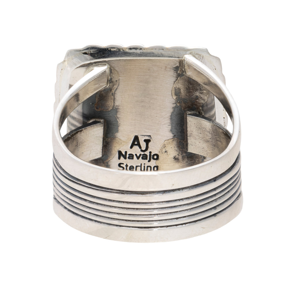 Navajo sterling silver and White Buffalo turquoise ring by Avin Joe. Square shaped natural, untreated stone set in sterling silver with classic twisted rope border. Stamped "Sterling" with maker's initials "AJ". Avin Joe, master Navajo silversmith born and raised on the Navajo Reservation, learned the trade through his father Phillip Joe who was taught by his uncle Kenneth Begay. Avin learned the basics through observation and developed his skills by taking silversmithing classes ag Ganado High School. During the next several years, Avin worked with various metals to learn their properties, reaction to heat, stamping, etc. and since the mid 1990s has worked almost exclusively in silver, perfecting his skills, to become a master silversmith, building top quality pieces featured in the finest galleries, museums and collections around the world.