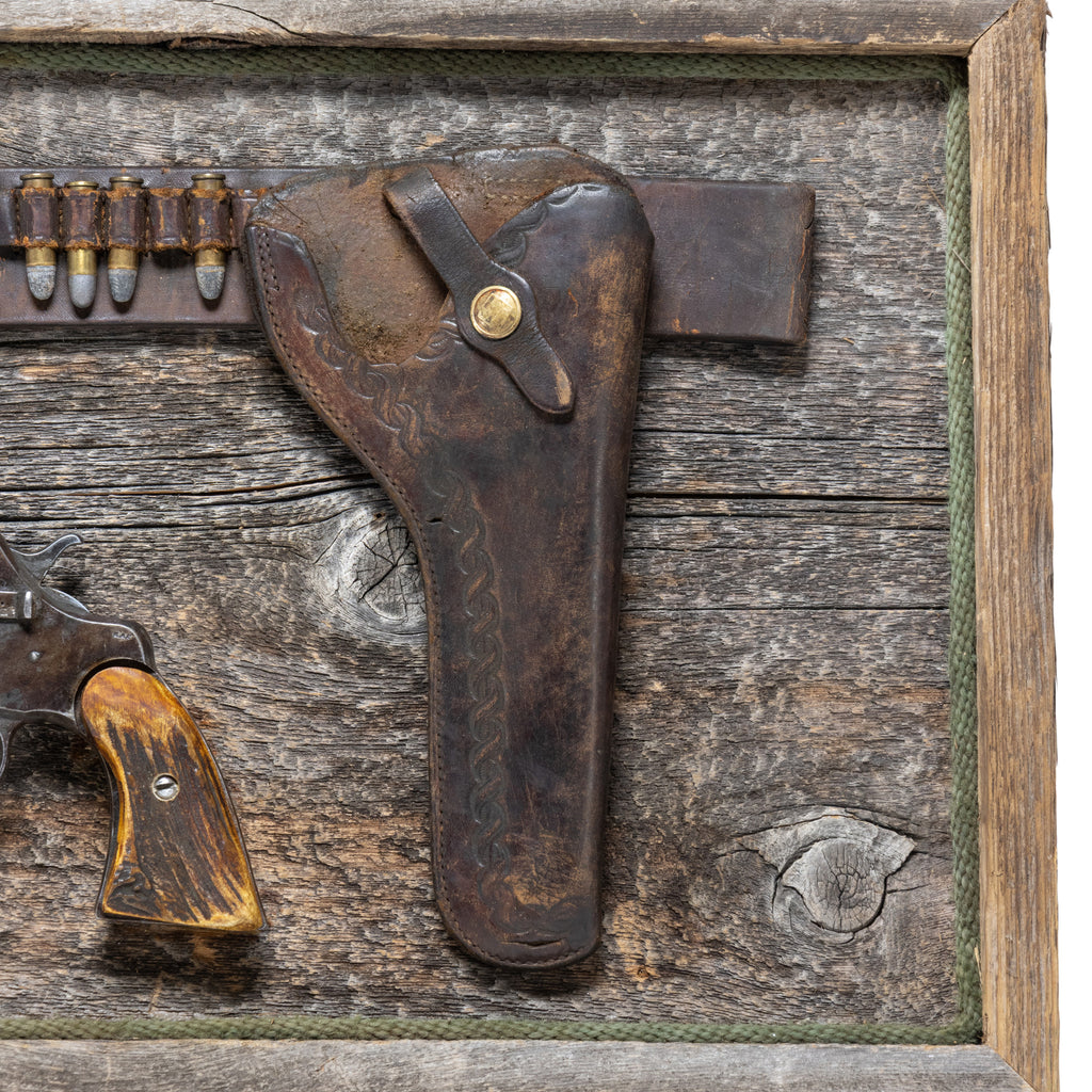 Navy model Colt, 1889, 38 long. Stag grips, holster and ammo box. Shadow box mounted 14" x 27" x 2".