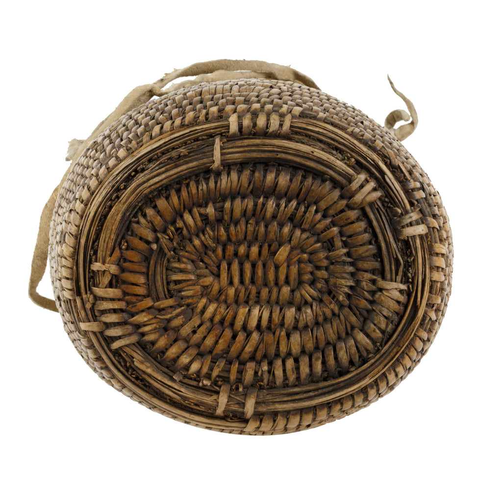 Thick and heavily woven. Much used over three generations. Patina from use. Brain tanned thongs around top.