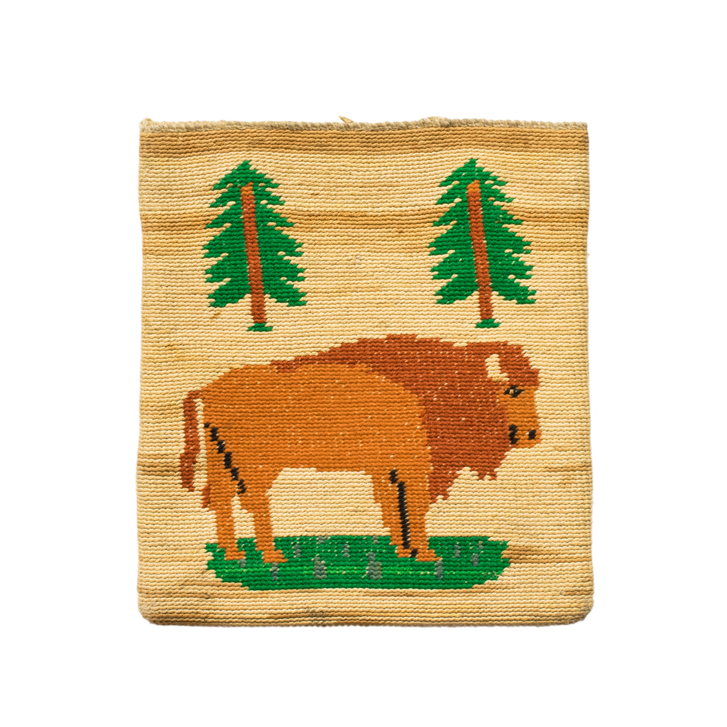 Nez Perce pictorial corn husk with buffalo and evergreens on one side, reverse eagle over flag. Linen on corn husk. Double pictorial, rare. Collector’s piece.