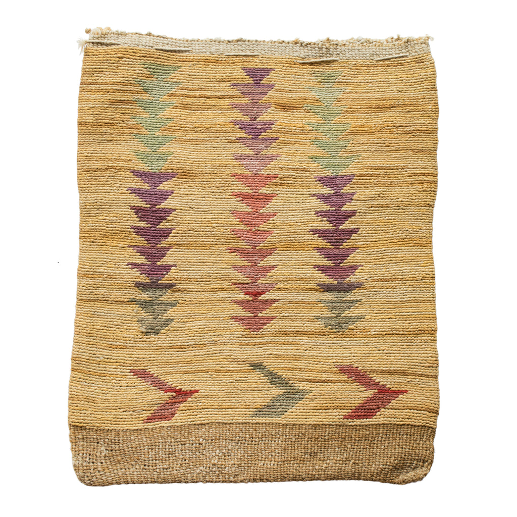 Nez Perce corn husk bag. Dyed corn husk and linen on corn husk.