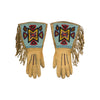 Exceptional Nez Perce gauntlets with geometric design, beads on back of hands and long fringe. Blue background, contour beaded. The United States Cavalry riders wore gauntlet gloves as part of their uniform, introducing the clothing style to plains tribes who turned the gloves into spectacular works of art with painstaking beadwork. As skilled horsemen, Sioux and other plains tribes took great pride in their horses and often wore symbols that celebrated their warrior and rider status, such as these gauntlets. Western cowboys and rodeo performers adopted the beaded gauntlets made by Native People into their fancy wear.