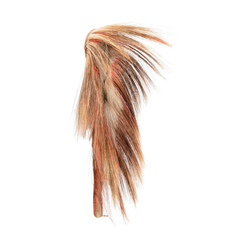 Original late 19th Century hair roach from the Nez Perce Slickpoo family in Lapwai, Idaho. Porcupine hair and woven deer tail on a cotton base with rare early original mineral color of red ochre. Shows much use and patina. The Slickpoo family are an important historic family of the Nez Perce in Idaho including Paul Slickpoo (Xa-Xaats-Tuustu, also known as Grizzly Bear Above, an image from 1895 of him is in the photo library), Author Allen P. Slickpoo author of Noon Nee-Me-Poo, Sam Slickpoo (image in photo library for example), and Josiah Slickpoo who the town of Slickpoo, Idaho is named after and helped Jesuit Priest Joseph Cataldo expand his mission across Southern Idaho. Provenance: From the Slickpoo family of Lapwai, Idaho; from a prominent Native American collection in Paris, France. Overall 16 1/2"L x 10"W