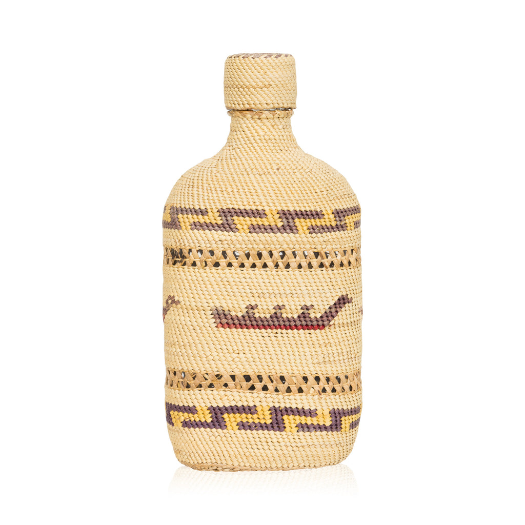 Nootka polychrome basketry lidded jar with whale boat motif, floating birds and geometrics. 8 1/2"H x 4 1/4"D x 1 1/4"