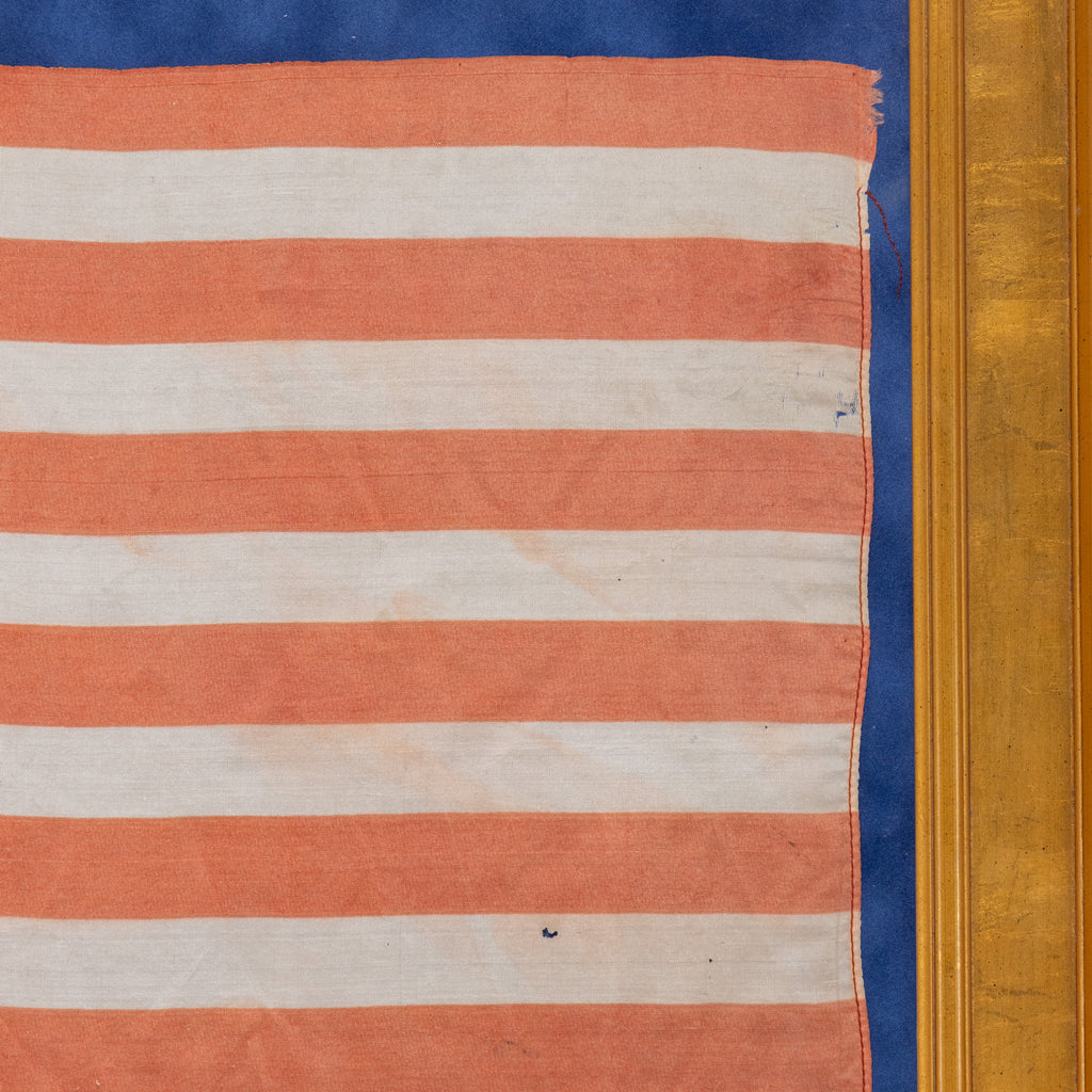 Framed 39 star "unofficial" North Dakota and South Dakota statehood flag. Having 39-stars issued at the time of North Dakota's admission to the union on November 2, 1889. As South Dakota was also admitted as the 40th State on the same day, this flag became instantly obsolete. During this time period when new flags were commissioned to keep up with the new states, upon the 39th State to enter into the Union, three other states were admitted as well. New flags only came out every July 4th, therefore, there was no "official" American flag in 1889 made with 39 stars. This "unofficial" American flag was likely a display flag used at political rallies and parades during the time used in celebration. Cotton flag 12" x 17" frame 24" x 31"
