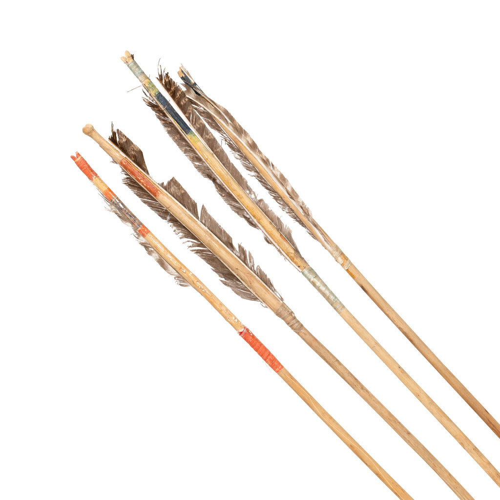 Four 19th Century Plains arrows. Extra long, trade steel tips, arrowheads secured with sinew wrappings and show feather fletching, also secured with sinew wrappings and some paint finishes. 26 1/2"L