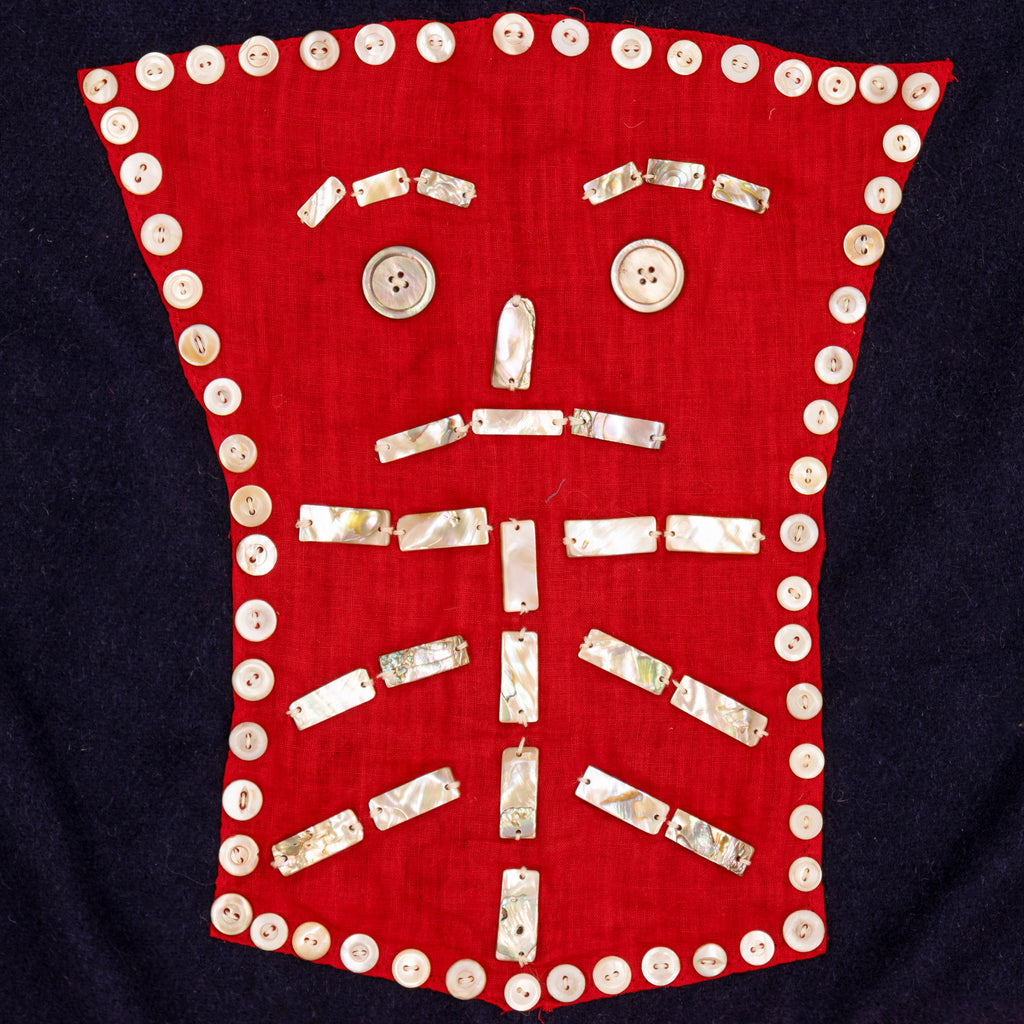Northwest Coast dance button apron with copper design (wealth symbol). Decorated with buttons, mother-of-pearl, abalone, and bells. 26" x 27". Used piece.