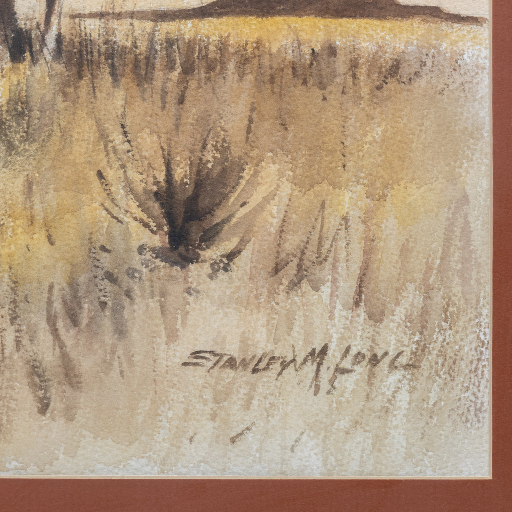 (1892-1972) Watercolor; 16" x 20". A California artist, Long spent his childhood on a ranch in Napa where he broke wild horses. He began sketching at an early age, was an art instructor, his western illustrations were featured in Sunset Magazine and The Los Angeles Times. Having worked with horses all his life they became the main theme for his paintings. His paintings provide an extemporaneous feeling with both airiness and activity. Work exhibited in the Young Museum, Oakland Museum, Shasta City Museum, Prudential Life Insurance Co., and Grand Central Art in New York. Well-listed artist.