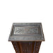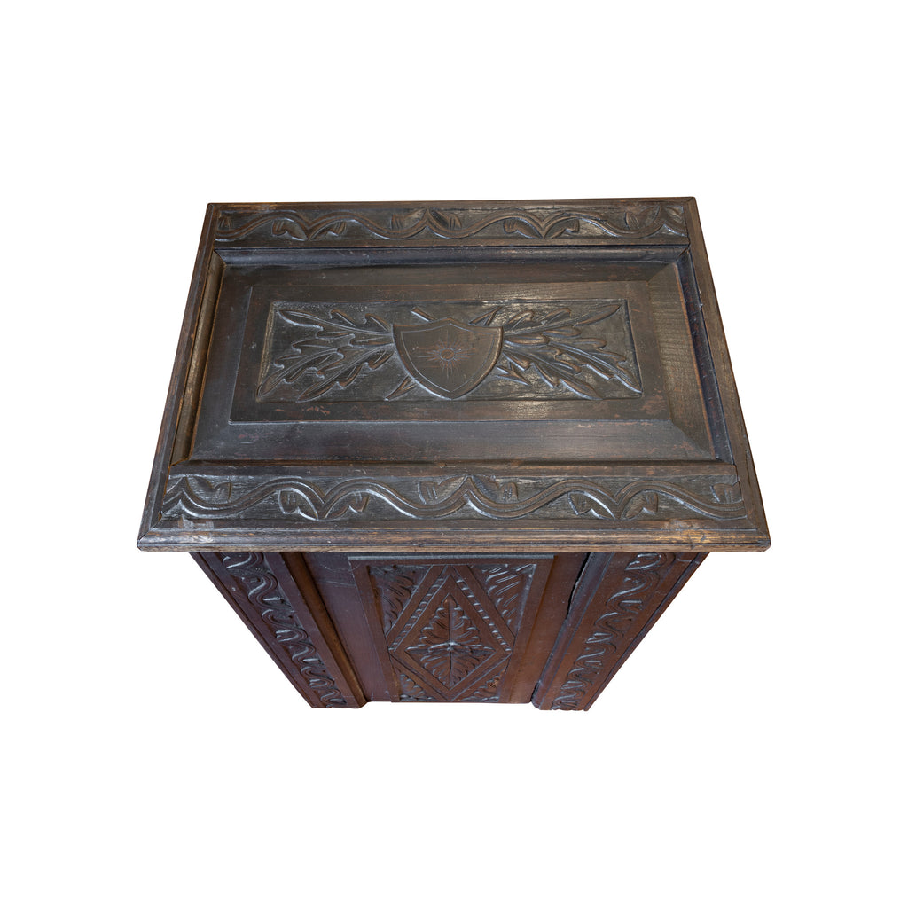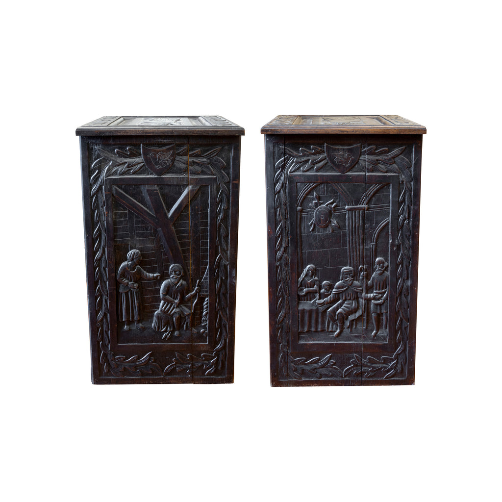Pair of heavily carved side tables each having one drawer and one door. English oak panels. Came over with a family from a vineyard in France to a new vineyard in California. The panels were later cut down and made into end/lamp tables. Original hardware.