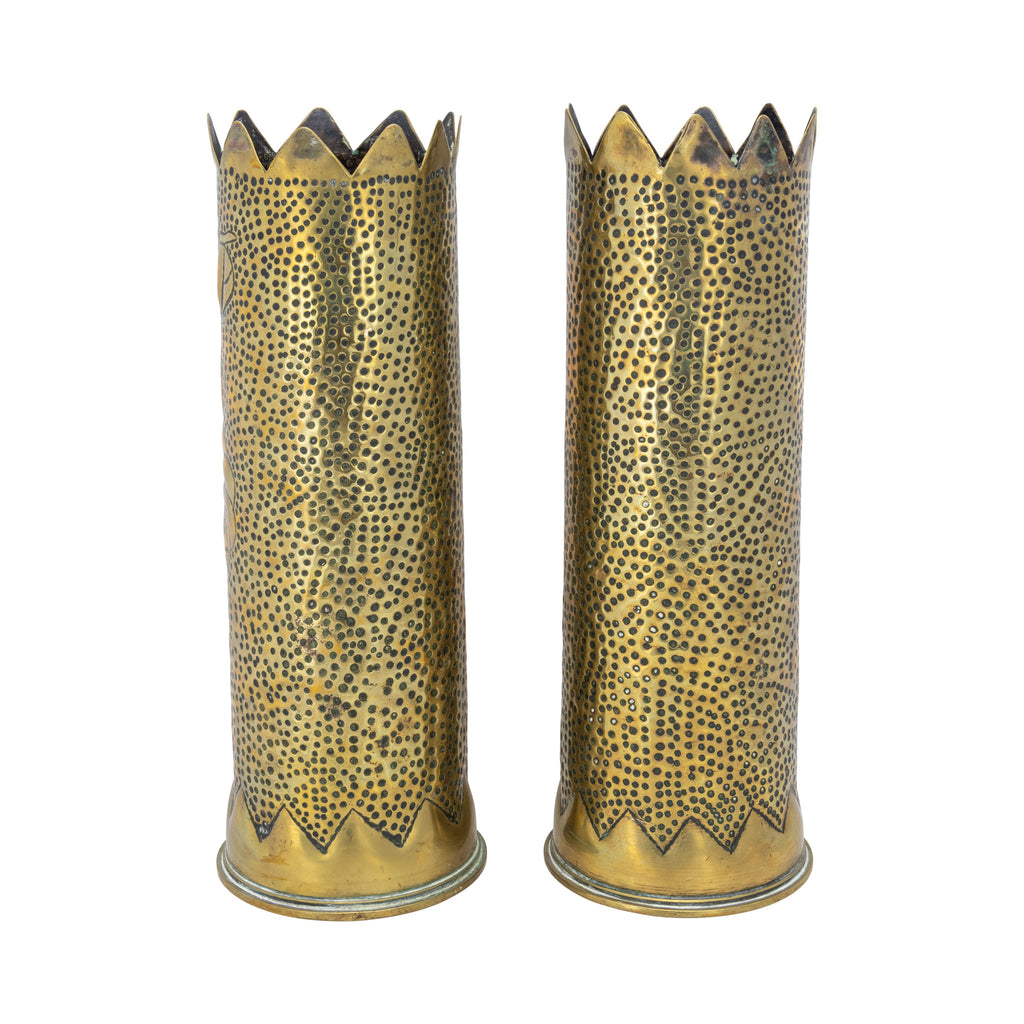 Matched pair of trench art vases with crown cut top, bottom floral, punctated. 11"H x 4"D
