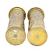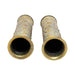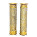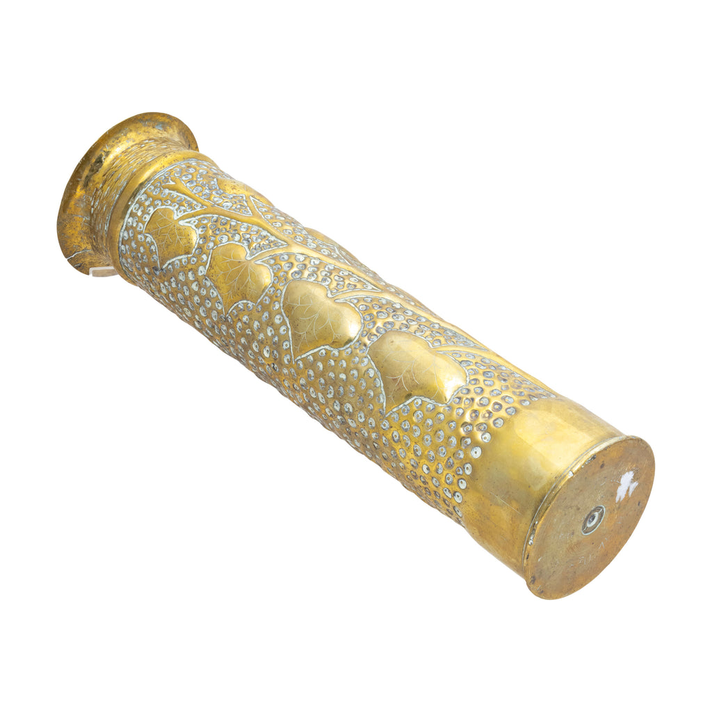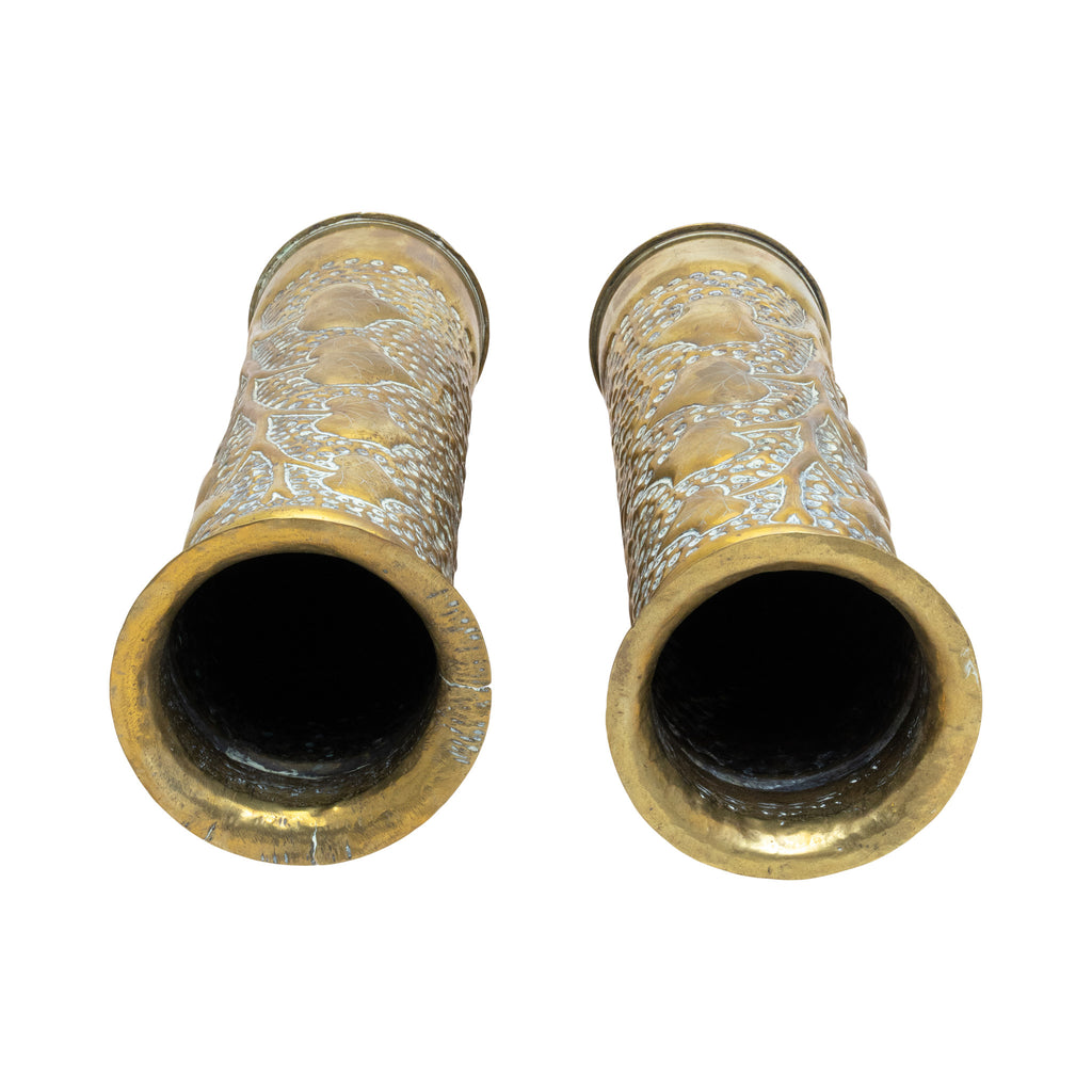 Pair of WWI trench art vases fashioned from artillery shells with repousse grape vine motifs on dotted ground with fluted rim. 3 1/2" x 14 1/2"