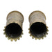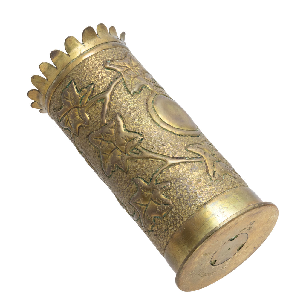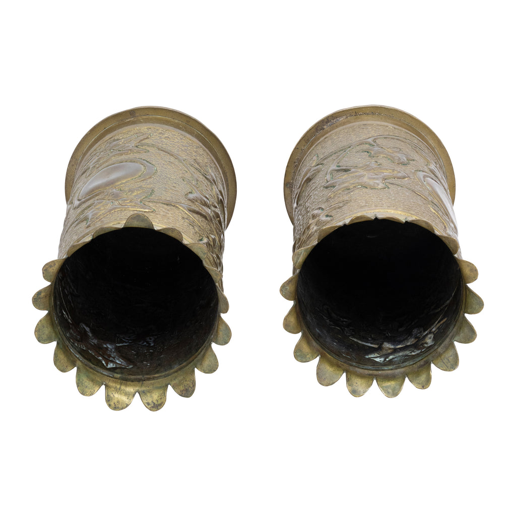 Pair of WWI trench art vases fashioned from artillery shells with scalloped rim over vines and central cartouche. 3 1/2" x 7 1/2"