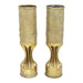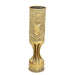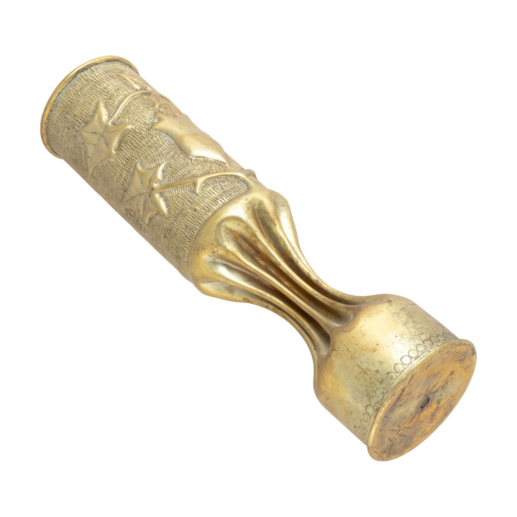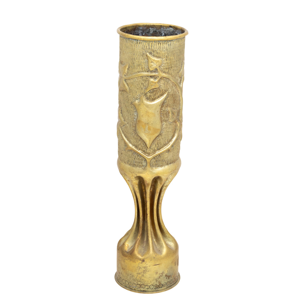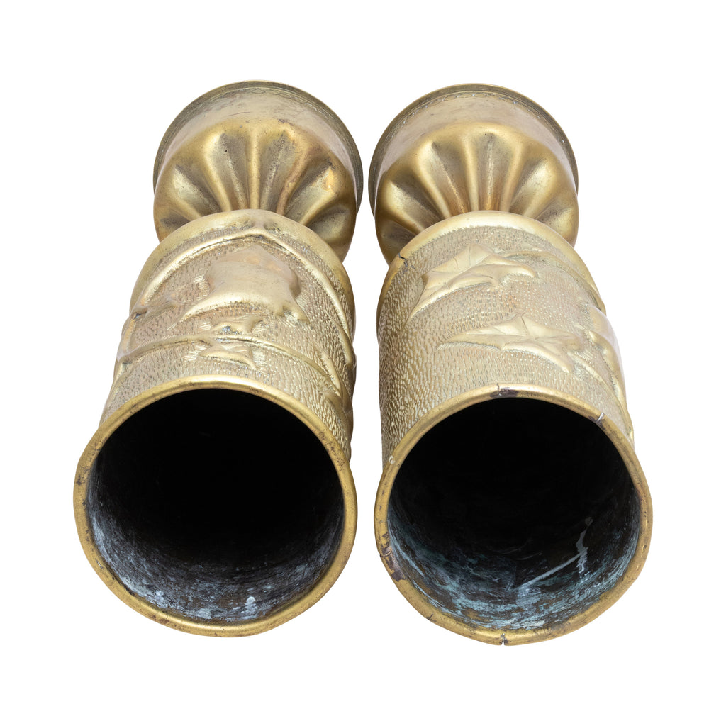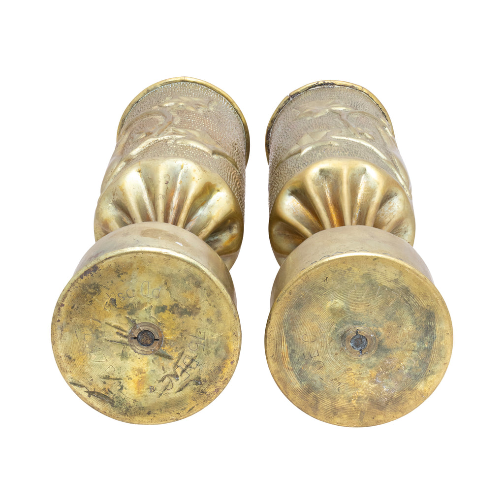 Pair of WWI era trench art vases fashioned from artillery shells with repousse vines and central cartouche over fluted stem. 13" x 3 1/4"