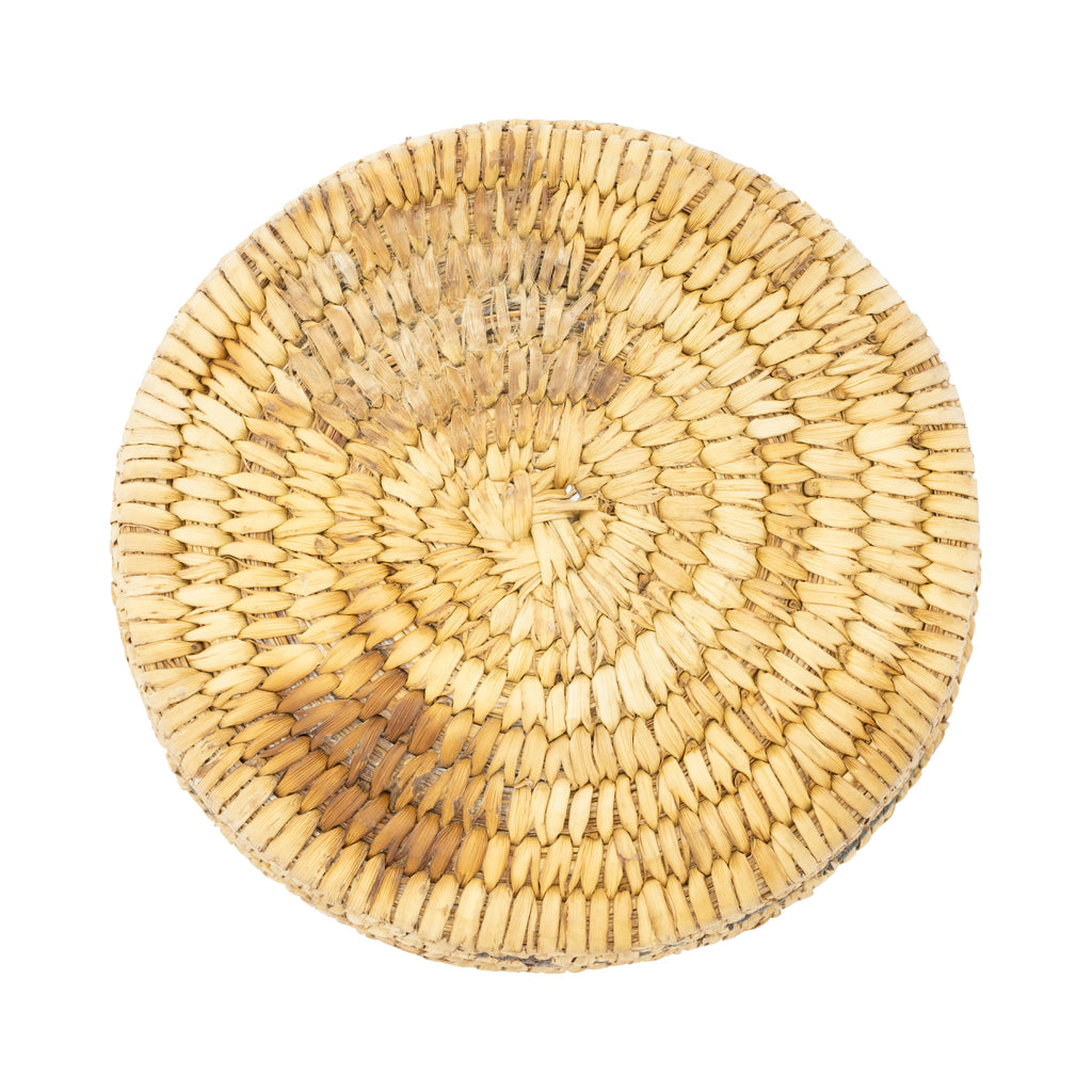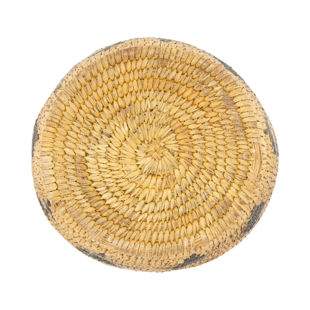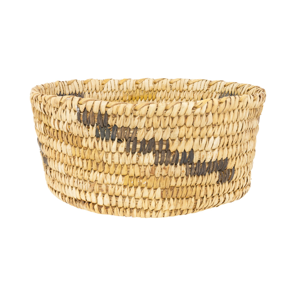 Pair of Papago polychrome basketry bowls. Both used pieces with bottom stains. Mid 20th Century. 7" x 3 1/2" and 7" x 4". Papago baskets are handcrafted of beargrass, yucca cactus (white or green) and Devil’s Claw (black). The technique used is known as coiling. Split stitch baskets are made of beargrass and sewn with yucca in such a manner that the coil is exposed to form part of the pattern. Made on the Papago Reservation in Southern Arizona, bounded on the east by historic San Xavier Mission on the west by organ Pipe Cactus National Monument.